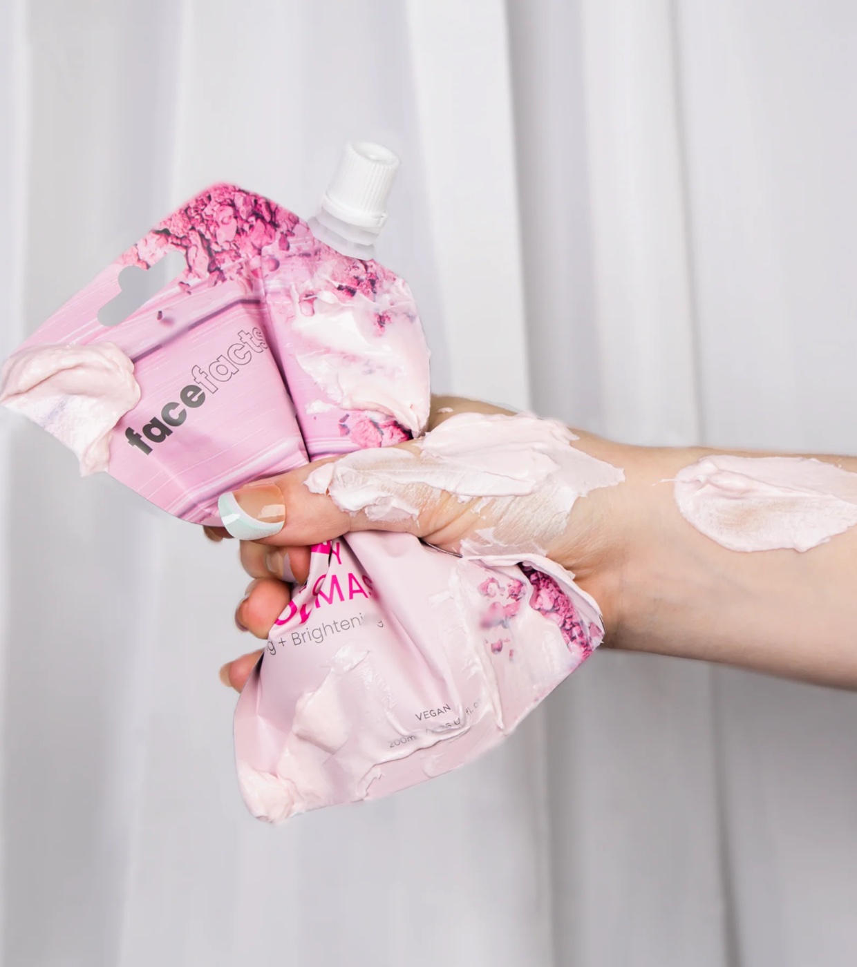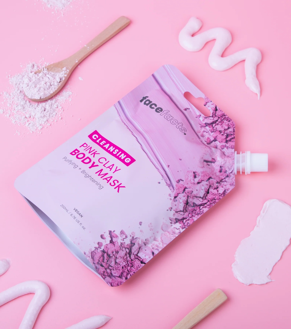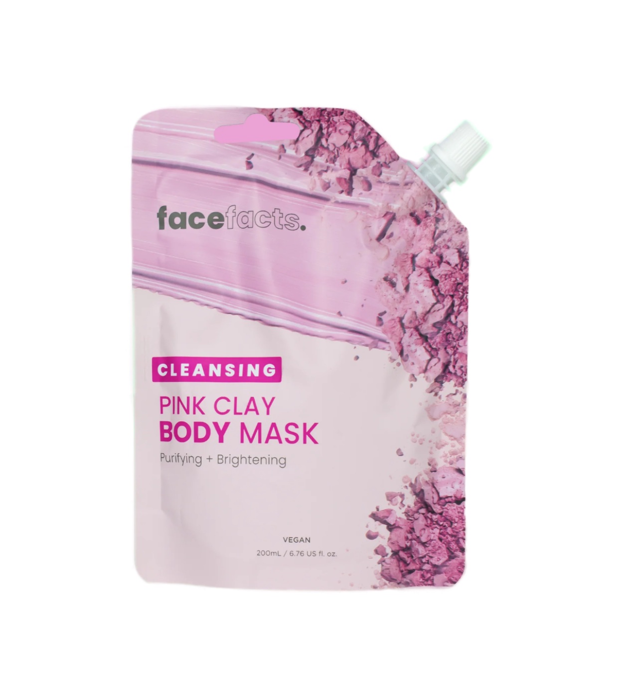 Reinigen und erhellen Sie Ihren Körper mit unserer rosa Tonmaske von Face Facts, die Ihre Haut sauber und weich macht.
