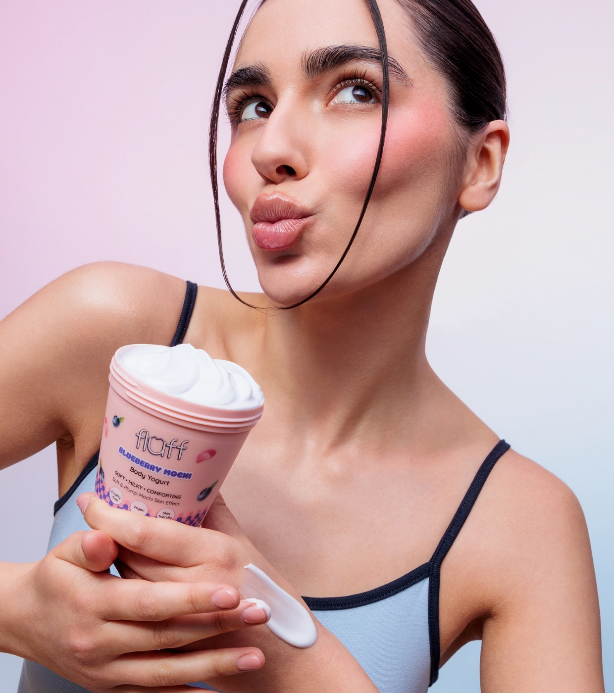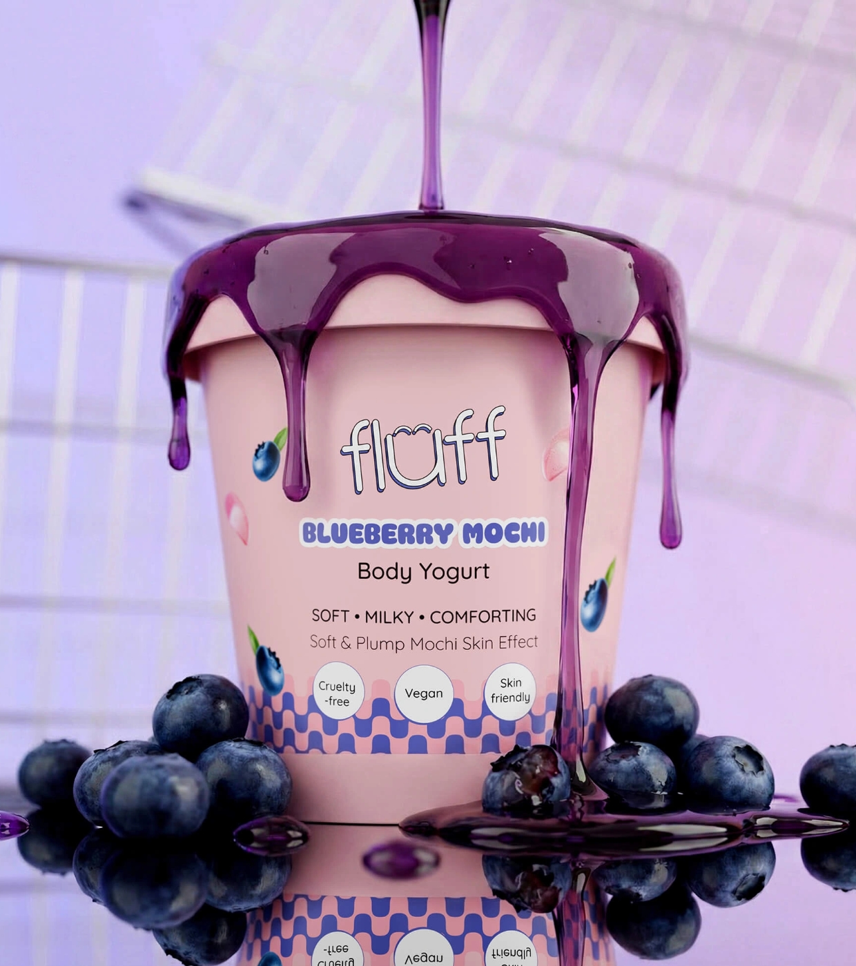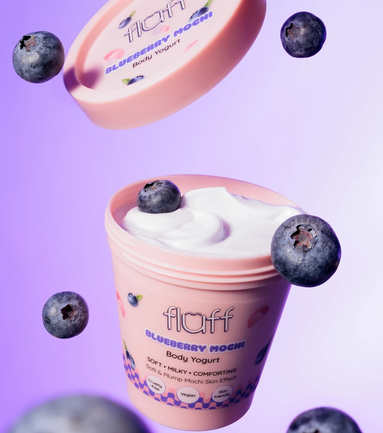 Verwandeln Sie Ihre Körperpflegeroutine in einen Genussmoment mit dem Blueberry Mochi Körperjoghurt von Fluff , der Ihre Haut mit Feuchtigkeit versorgt, sie weich macht und sie mit einem köstlich süßen Aroma umhüllt.