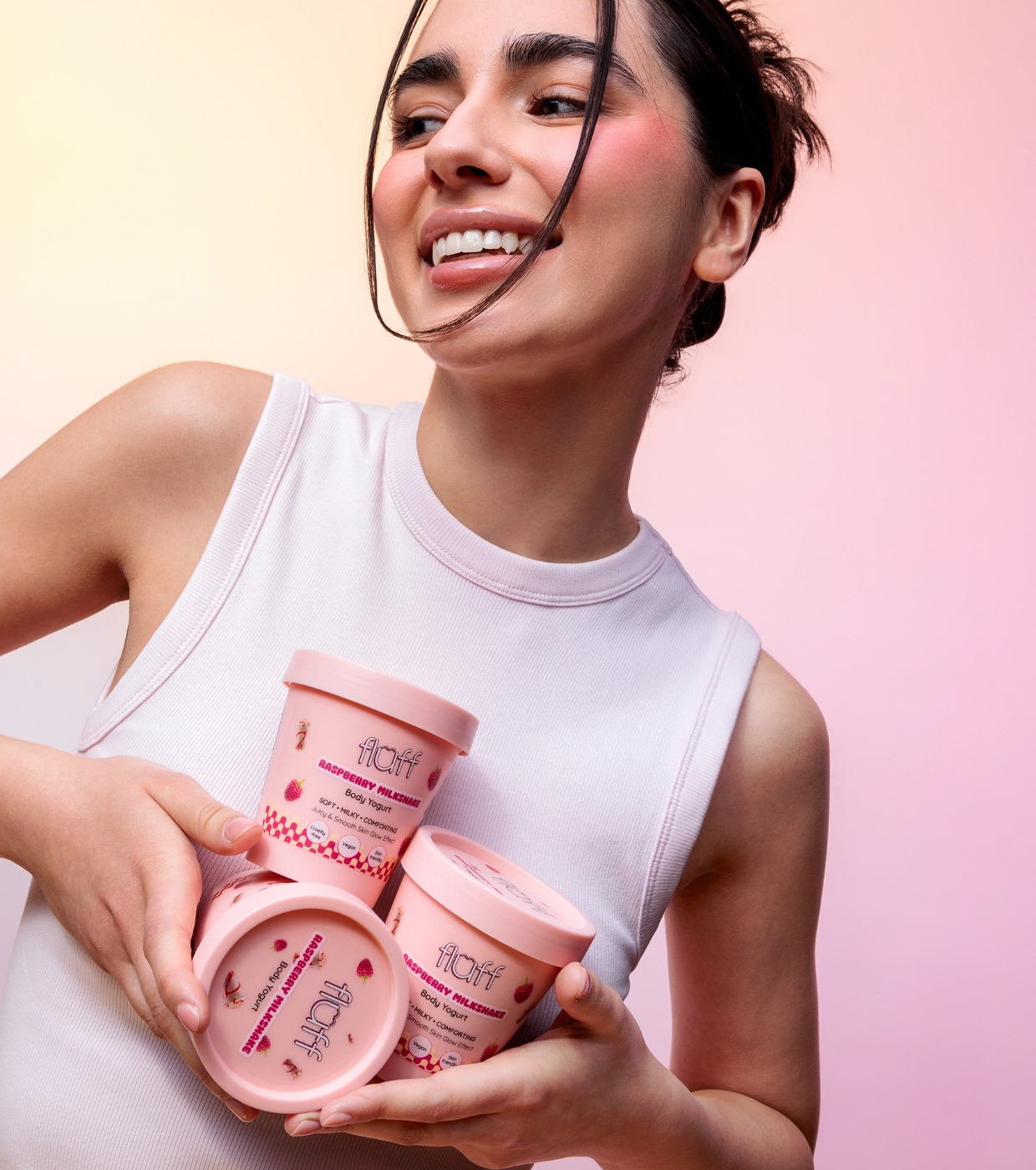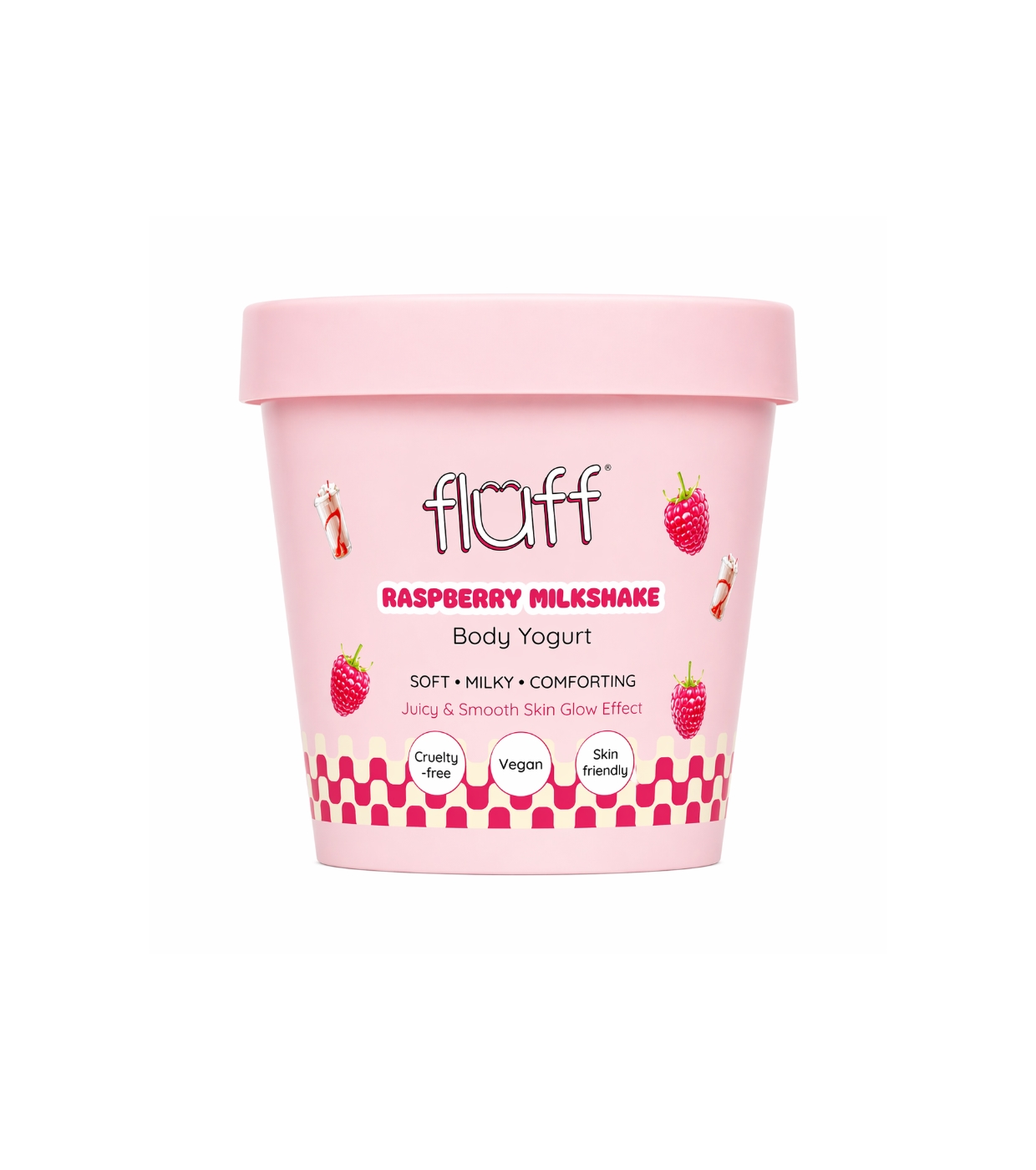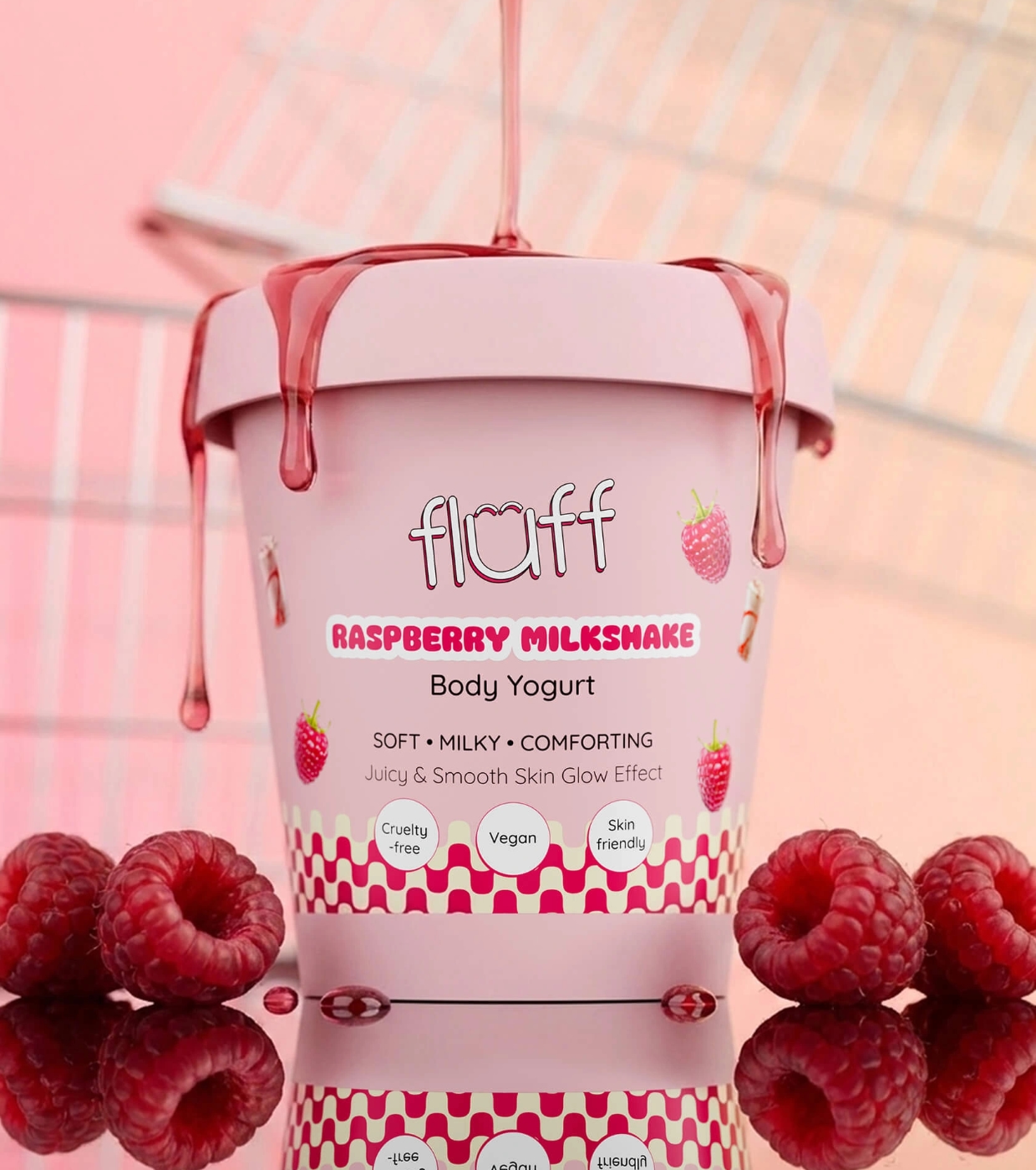 Genießen Sie weiche, gepflegte und herrlich duftende Haut mit Fluff Fluff Body Yogurt , dem Body Yogurt, der Ihre Haut pflegt und sie gleichzeitig mit einem unwiderstehlich süßen Himbeeraroma umhüllt.