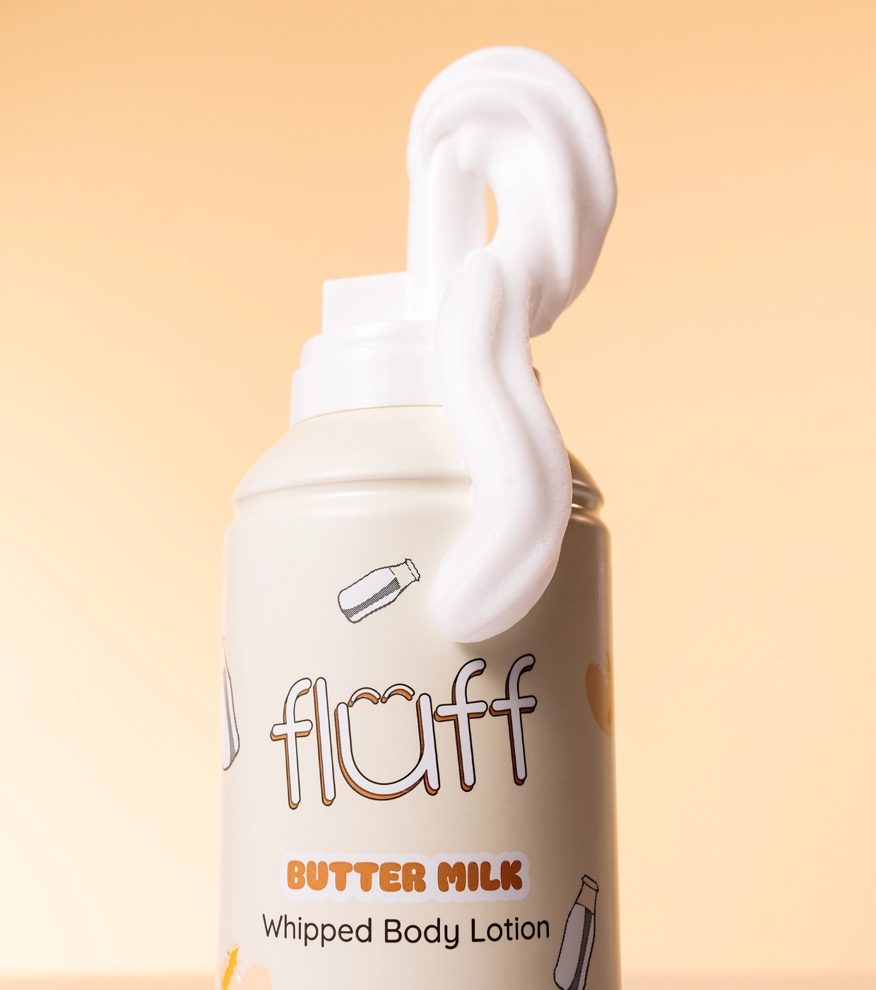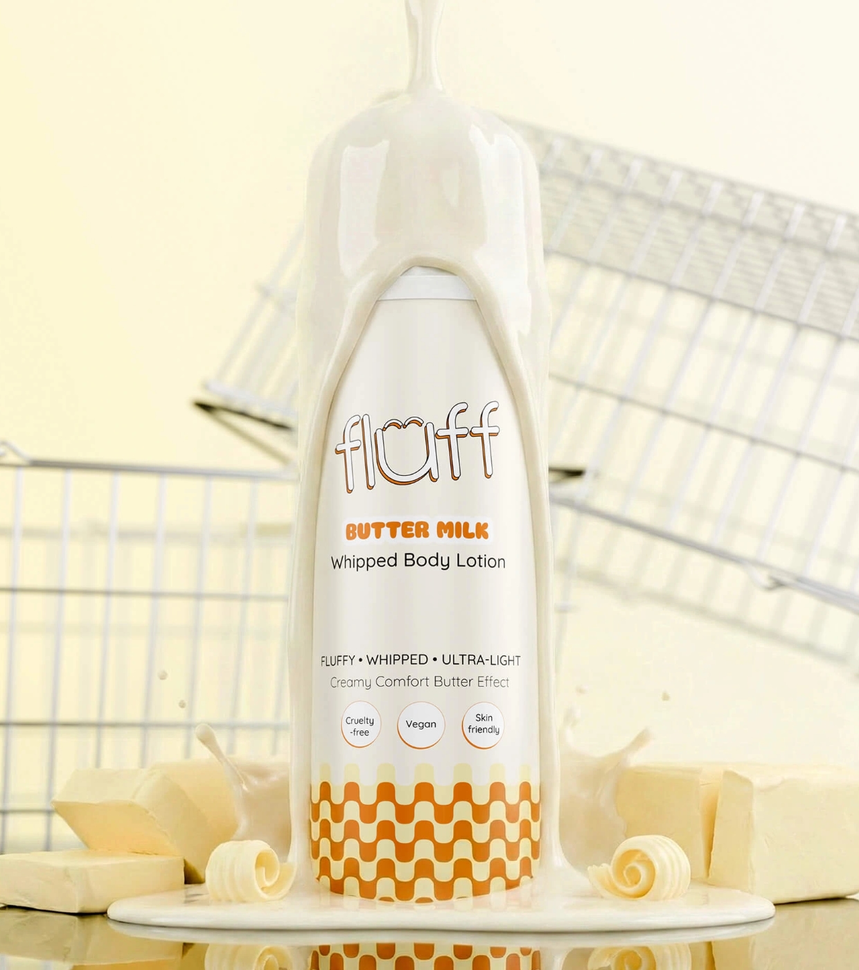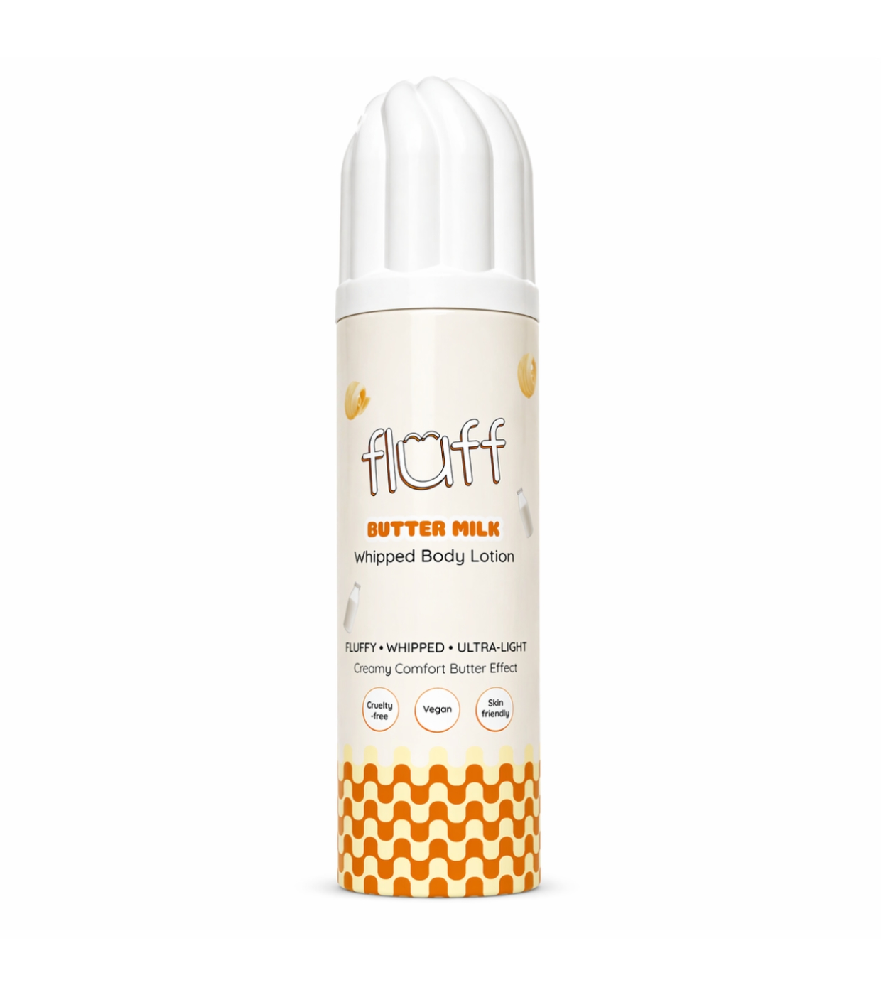 Verwöhnen Sie Ihre Haut mit einem Gefühl von Wohlbefinden mit der Butter Milk Körperlotion von Fluff , dem Körperbalsam mit Mousse-Textur, der die Haut mit Feuchtigkeit versorgt, weich macht und beruhigt, ohne ein schweres Gefühl zu hinterlassen.