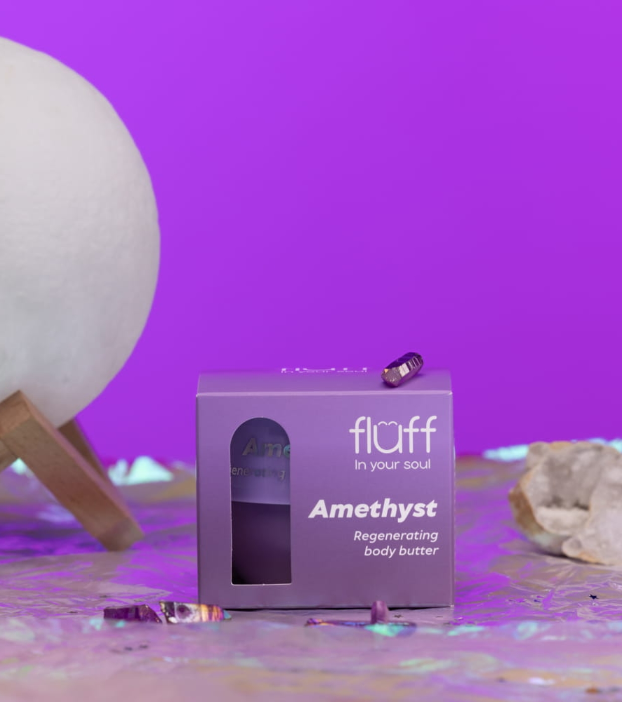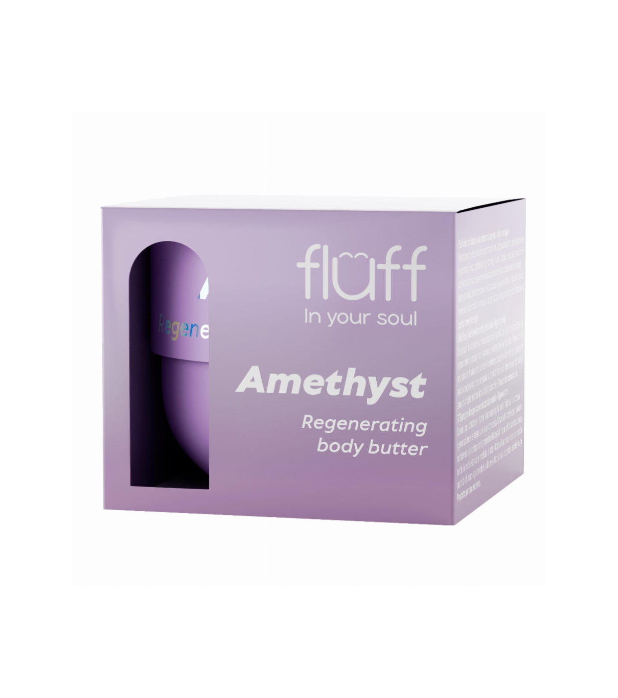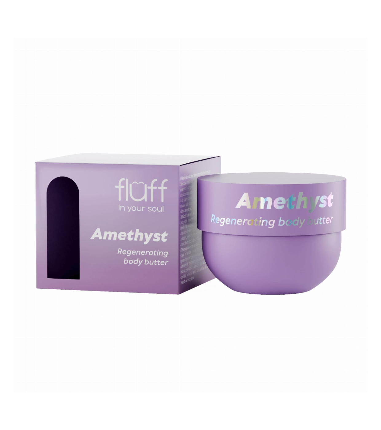 Fluff Regenerierende Körperbutter mit Amethyst-Extrakt wurde entwickelt, um die Haut intensiv mit Feuchtigkeit zu versorgen und zu nähren, ihren Regenerationsprozess anzuregen und einen gesunden Glanz wiederherzustellen.