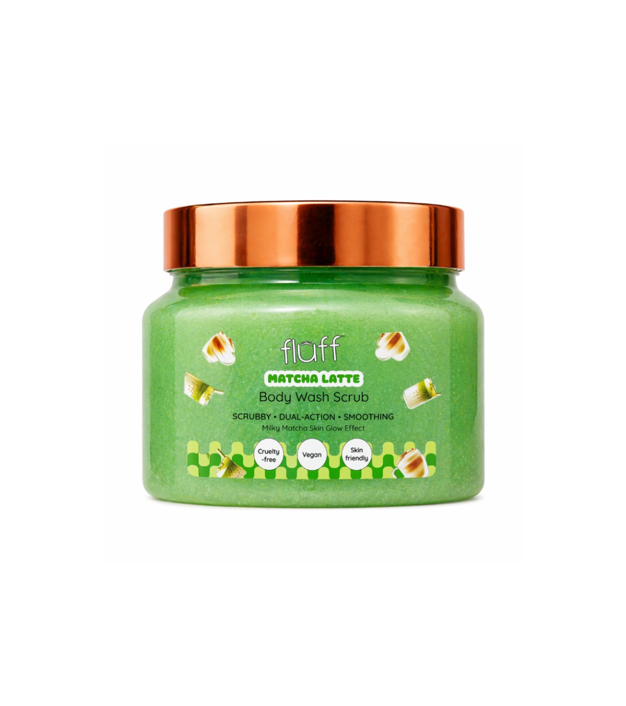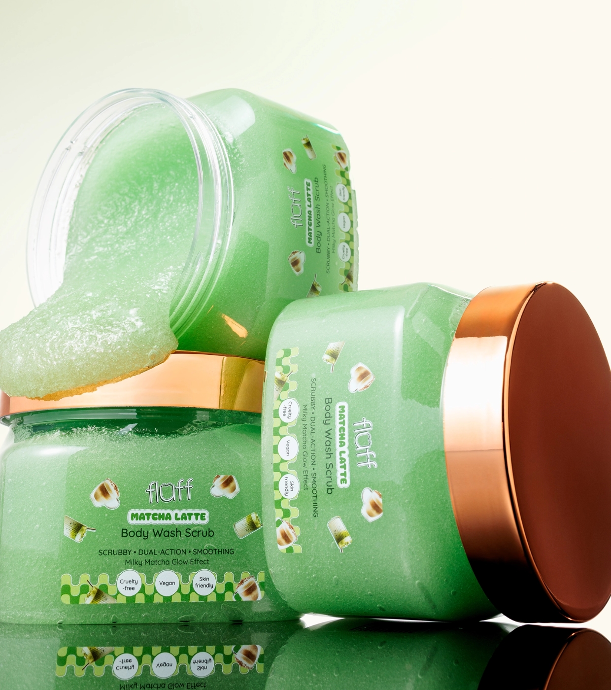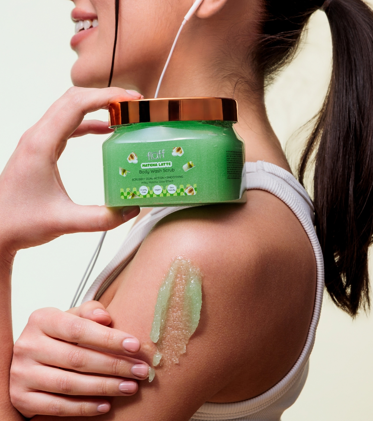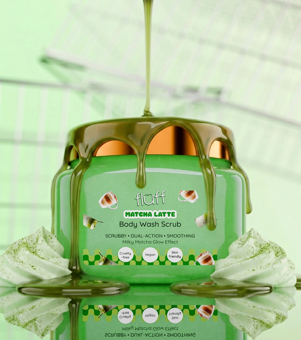 Genießen Sie weiche, frische und ausgeglichene Haut mit dem Matcha Latte Körperpeeling von Fluff, dem Körperpeeling, das Ihre Haut reinigt, peelt und pflegt, ohne sie auszutrocknen.