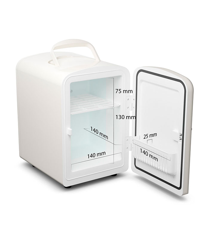 Ein origineller Mini-Kosmetikkühlschrank, ideal, um eine Vielzahl von Kosmetikprodukten gekühlt und unter optimalen Bedingungen aufzubewahren (Gesichtscremes und -masken, Gesichtsampullen, Seren, Augenkonturcremes, Make-up, Körpercremes, Gesichtsnebel und -sprays, Rollen und Steine, Bio-Schönheit mit natürlichen Inhaltsstoffen usw.).