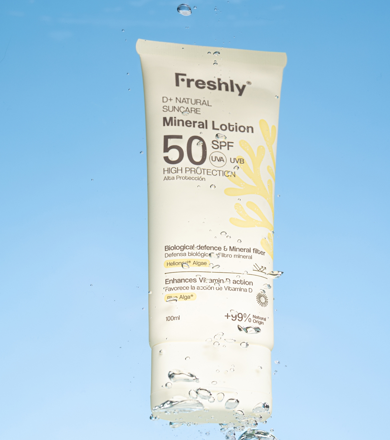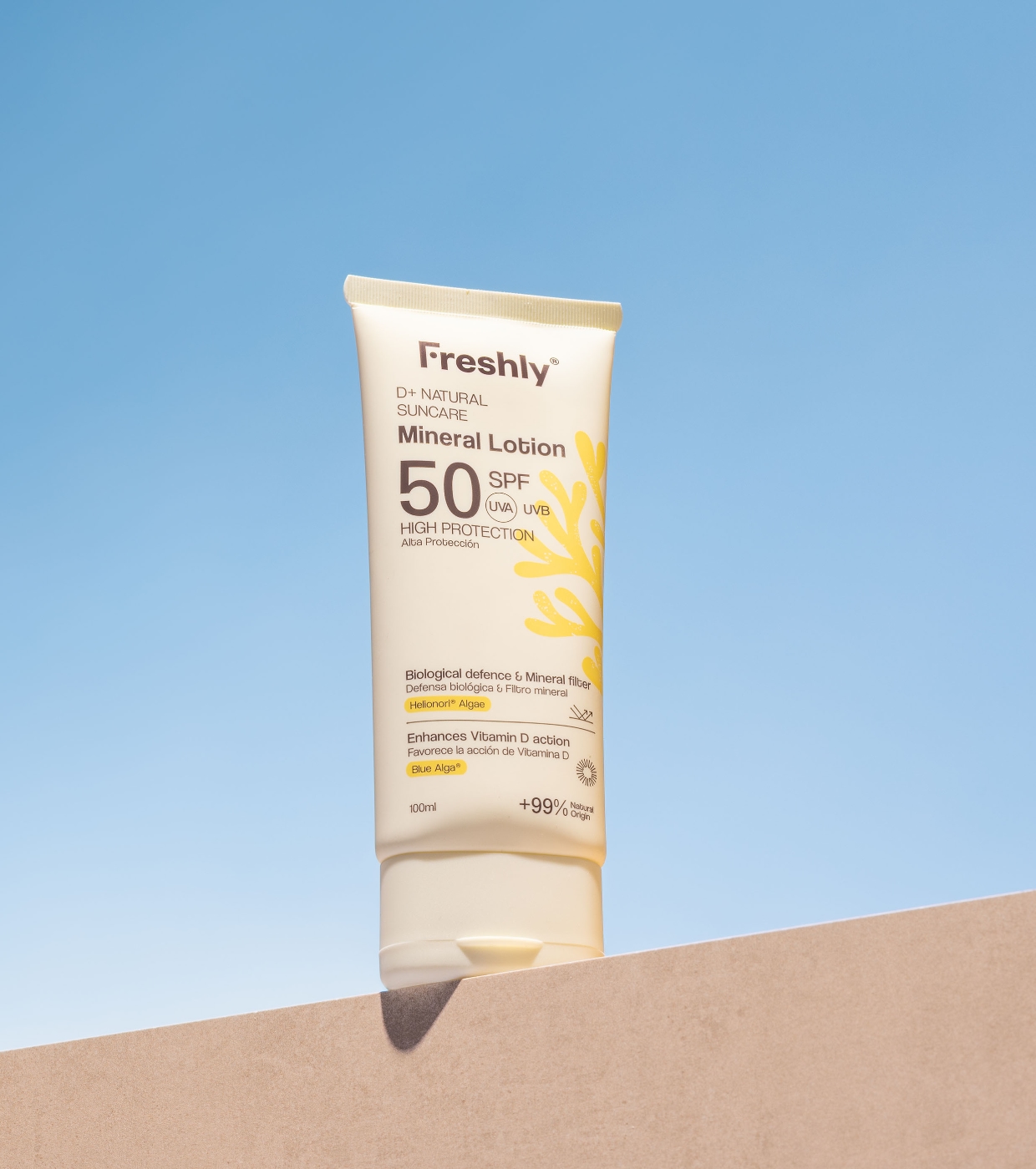 Schützen Sie Ihre Haut vor Sonnenschäden mit dieser Körpersonnencreme D+ Natural Suncare SPF50 von Freshly Cosmetics, die ohne chemische Filter oder Nanopartikel formuliert wurde.