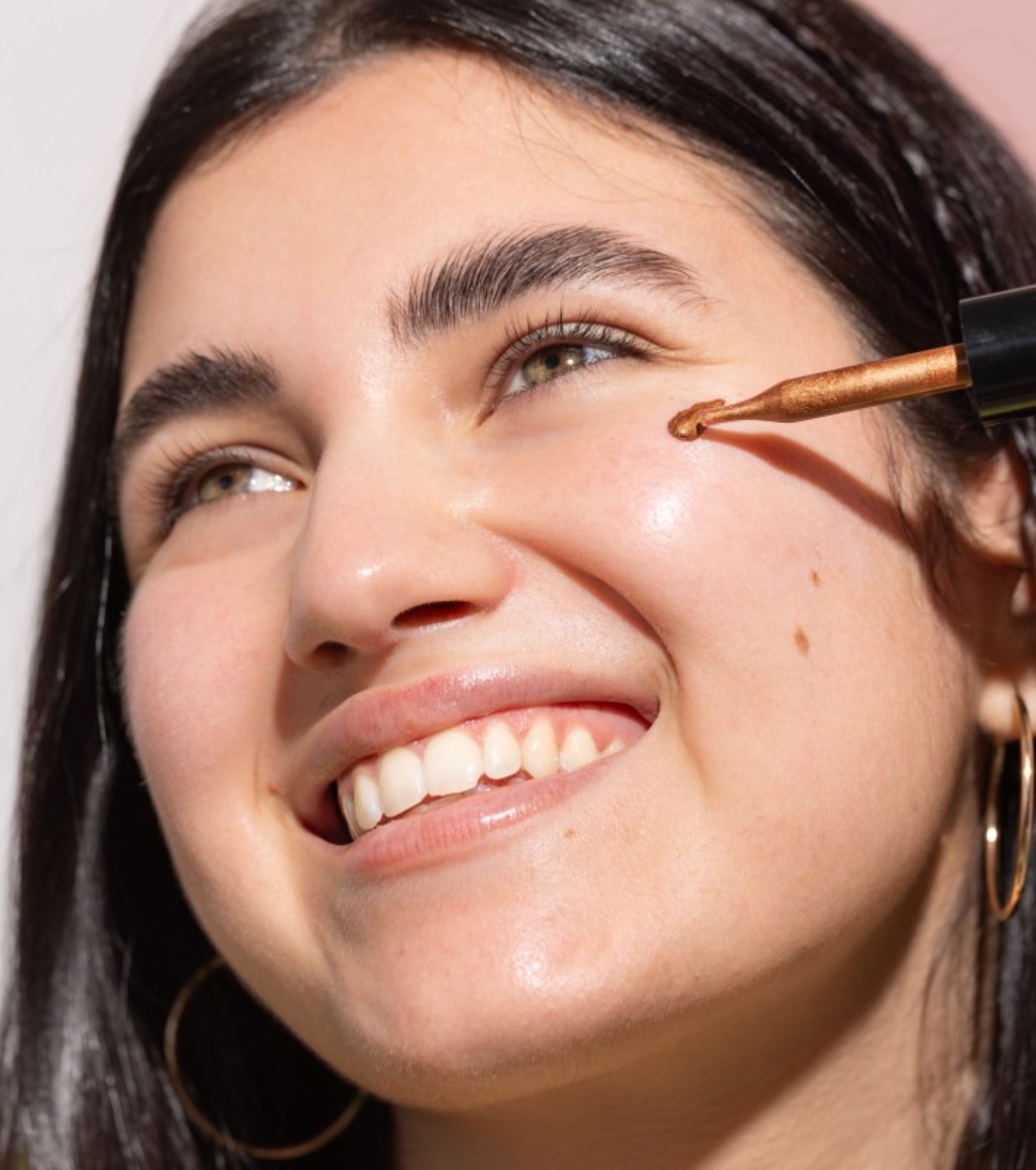 2. Wenn Ihr Gesicht sauber und gut mit Feuchtigkeit versorgt ist, tragen Sie mit der Pipette ein paar Tropfen auf die Bereiche auf, die Sie hervorheben möchten, wie z. B. die Wangenknochen oder den Nasenknochen, um einen sonnenverwöhnten Effekt zu erzielen.
