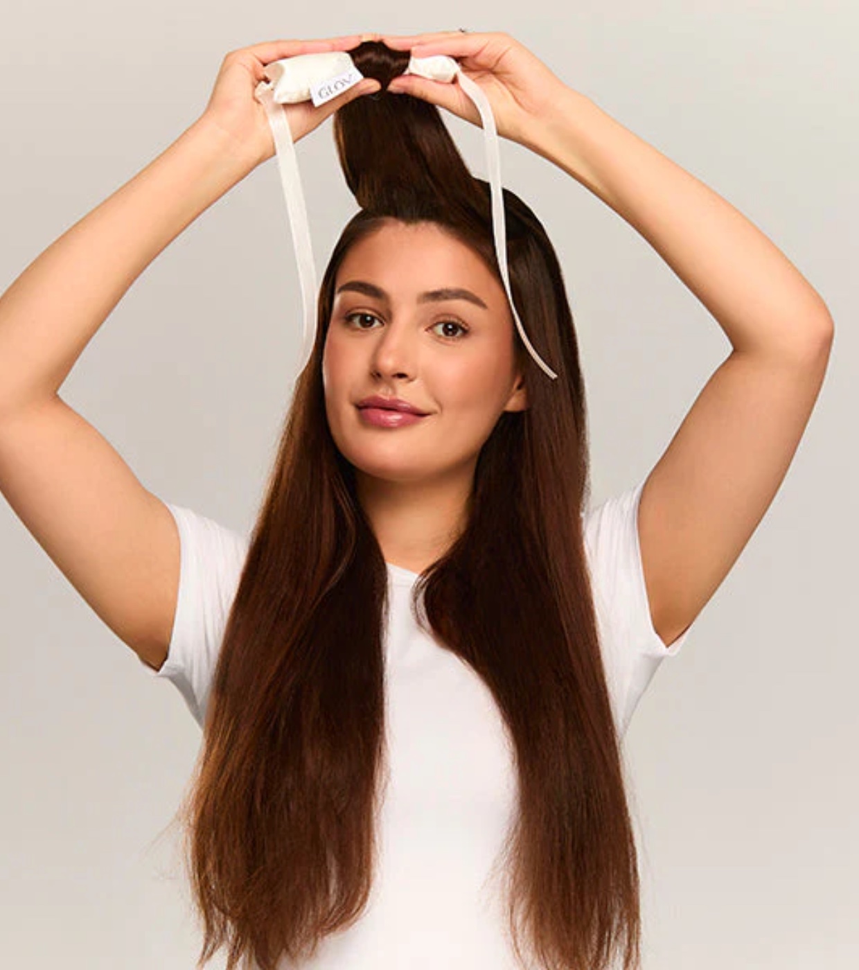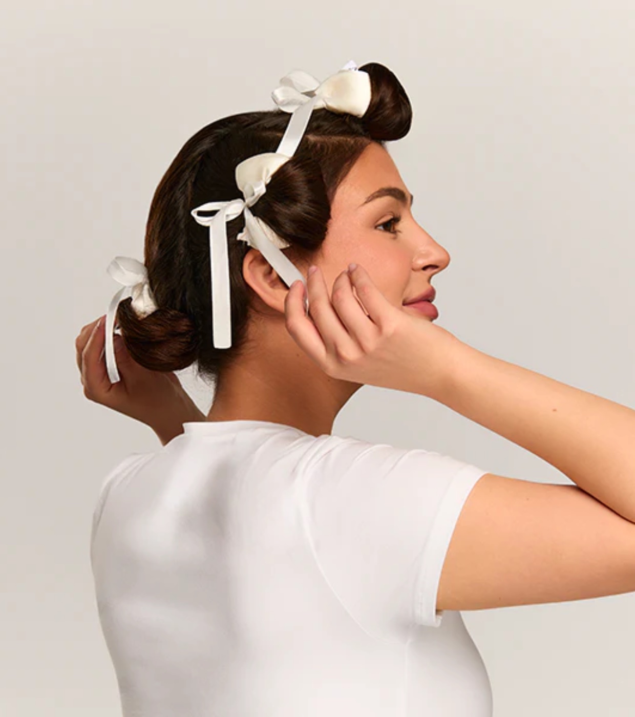 Teilen Sie einfach Ihr Haar, wickeln Sie es um die Lockenwickler und befestigen Sie es mit den bezaubernden Bändern.