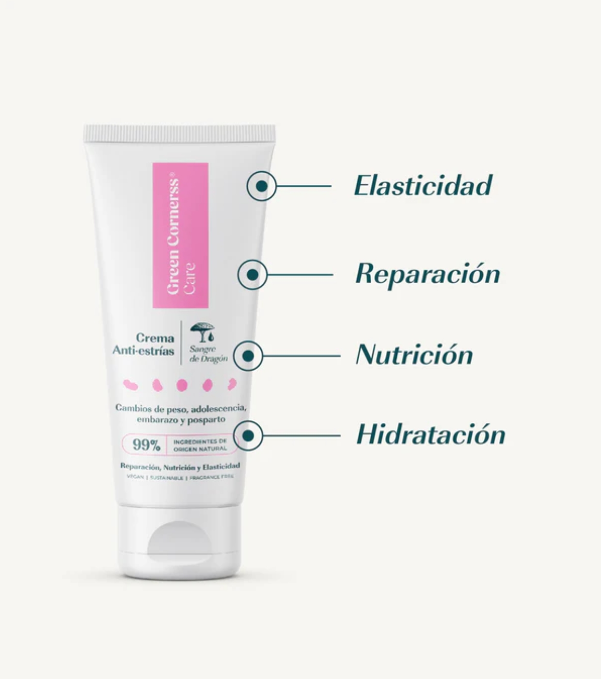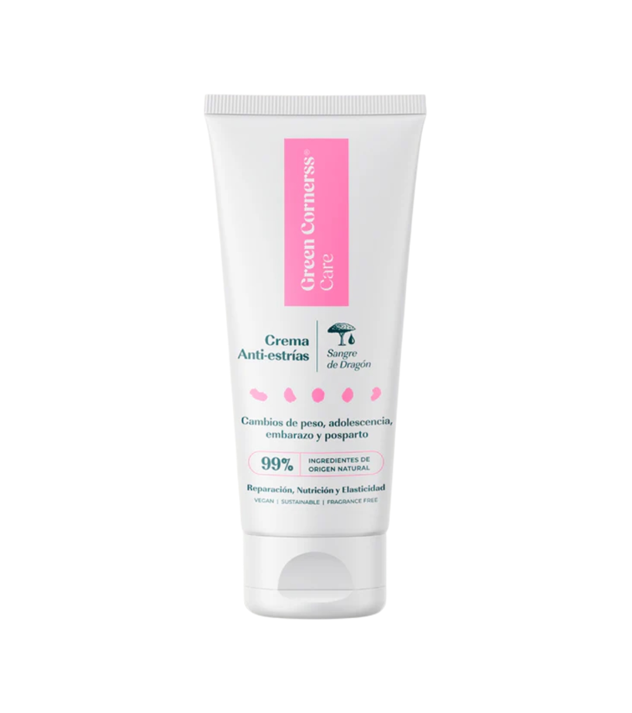 Green Cornerss Die Anti-Dehnungsstreifen-Creme besteht zu 99 % aus natürlichen Inhaltsstoffen und wurde entwickelt, um Dehnungsstreifen vorzubeugen und zu behandeln, die durch Schwangerschaft, Stillen, hormonelle Veränderungen, Gewichtsschwankungen oder Sport verursacht werden.