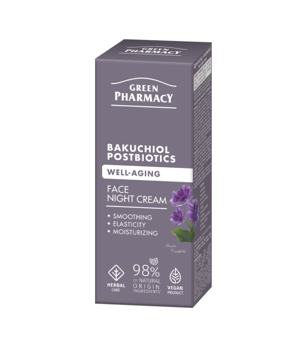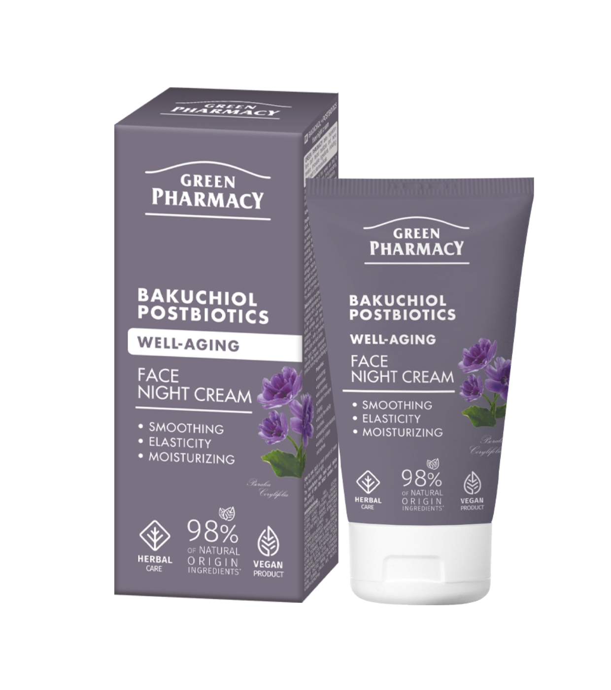 Green Pharmacy Die Anti-Aging-Nachtgesichtscreme mit Backuchiol und Postbiotics wurde entwickelt, um tiefe Feuchtigkeit zu spenden und die Schutzbarriere der Haut über Nacht zu stärken.