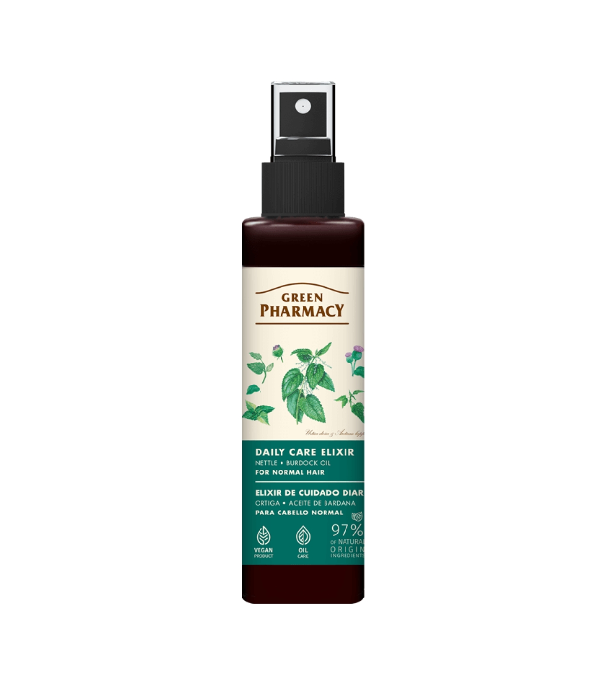 Green Pharmacy Haarelixier für normales Haar mit Brennnessel- und Klettenöl bietet umfassende Pflege und verbessert die Gesundheit und das Aussehen des Haares von der Wurzel bis zur Spitze.