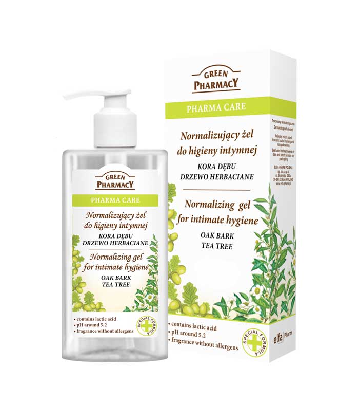Normalisierung des Intimhygienegeles Pharma Care mit Eichenrinde und Teebaum von Green Pharmacy.