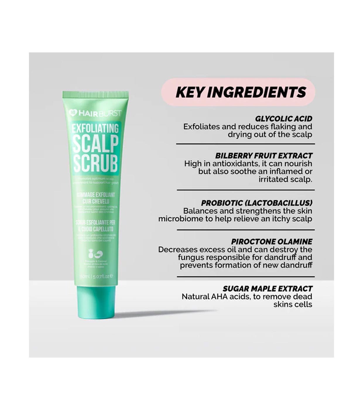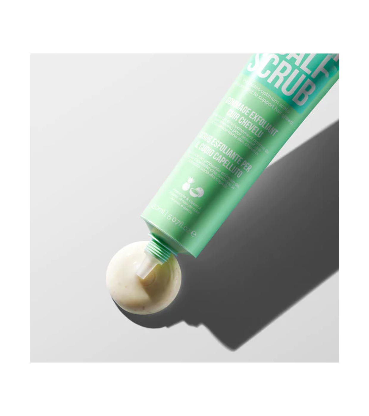 Die Formel enthält Glykolsäuren, um die Kopfhaut chemisch zu peelen, sowie Pfirsichsamen und Bambusstielpulver, um manuell zu peelen und ein gesundes Haarmilieu zu fördern.