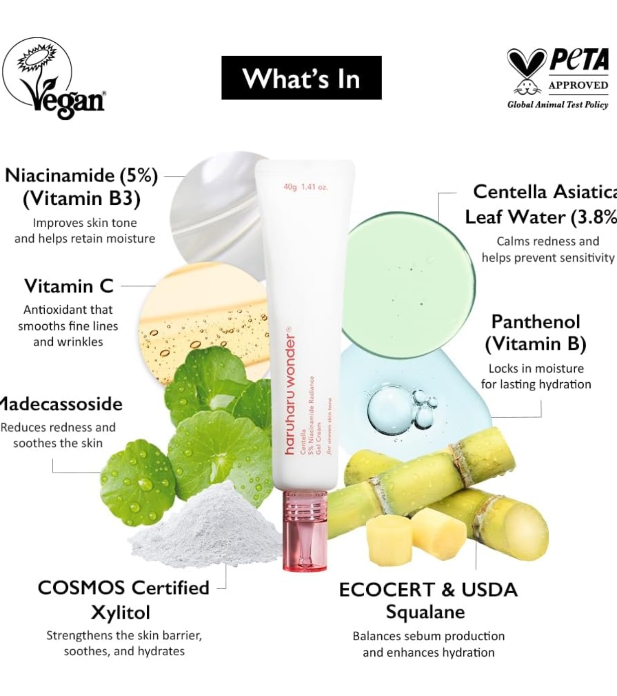 Water, Niacinamide (5%), Propanediol, Centella Asiatica Leaf Water(3.8%), Glycerin, Butylene Glycol Dicaprylate/Dicaprate, Squalane(2%), 1,2-Hexanediol, Cetearyl Olivate, Panthenol, Ammonium Acryloyldimethyltaurate/VP Copolymer, Sorbitan Olivate, Carbomer, Sclerotium Gum, Tromethamine, Helianthus Annuus (Sunflower) Seed Oil, Xanthan Gum, Madecassoside (1,000ppm), Ethylhexylglycerin, Disodium EDTA, Xylitol, Ascorbic Acid