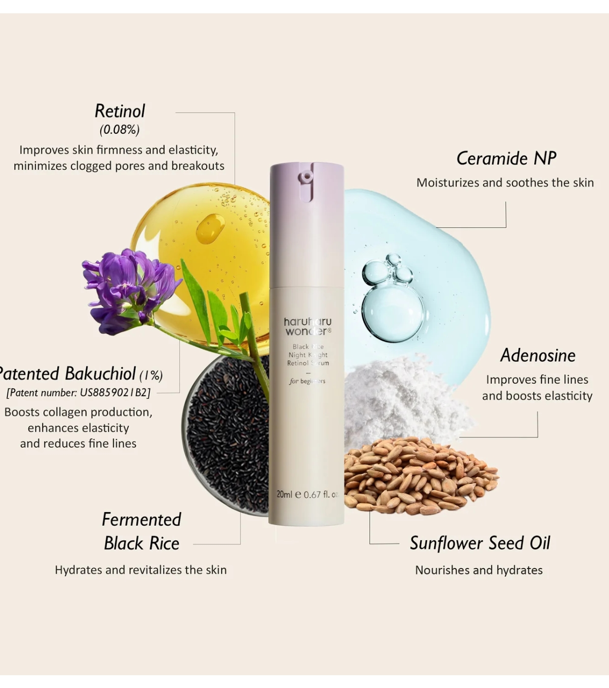 Verwandeln Sie Ihre Haut mit dem Serum Retinol Black Rice Night Knight von Haruharu Wonder, das speziell für empfindliche Haut und Retinol-Anfänger entwickelt wurde.