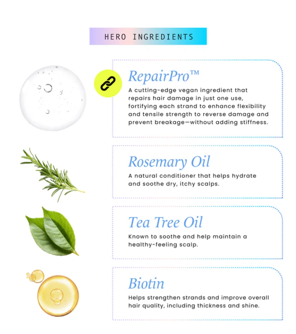 Aqua/Water/Eau, Polysorbate 20, Glycerin, Rosmarinus officinalis (rosemary) flower oil, Melaleuca alternifolia (tea tree) leaf oil, Biotin, Itaconic acid, Arginine, Panthenol, Linum usitatissimum seed extract, Salvia hispanica seed extract, Polyglyceryl-10 laurate, Benzyl alcohol, Xylitol, Caprylic acid, Coffea arabica (coffee) seed oil, Hydrolyzed collagen, Tocopherol, Helianthus annuus (sunflower) seed oil, Hydrolyzed soy protein, Hydrolyzed rice protein, Menthol, Zea mays (corn) starch, Hydroxyethylcellulose, Sodium benzoate, Sodium salicylate, Potassium hydroxide, Potassium sorbate, Parfum/Fragrance, Benzyl benzoate, Camphor, Citronellol, Citrus limon peel oil, Coumarin, Limonene, Linalool, Linalyl acetate, Mentha piperita oil, Pinene, Tetramethyl acetyloctahydronaphthalenes.