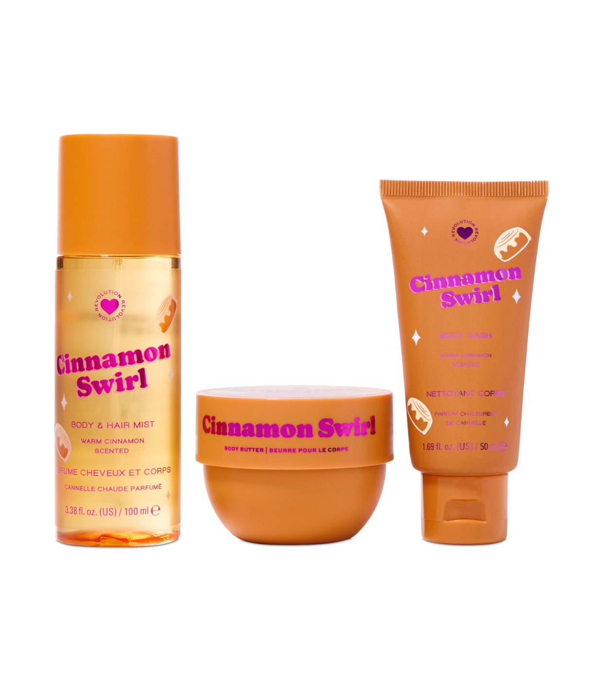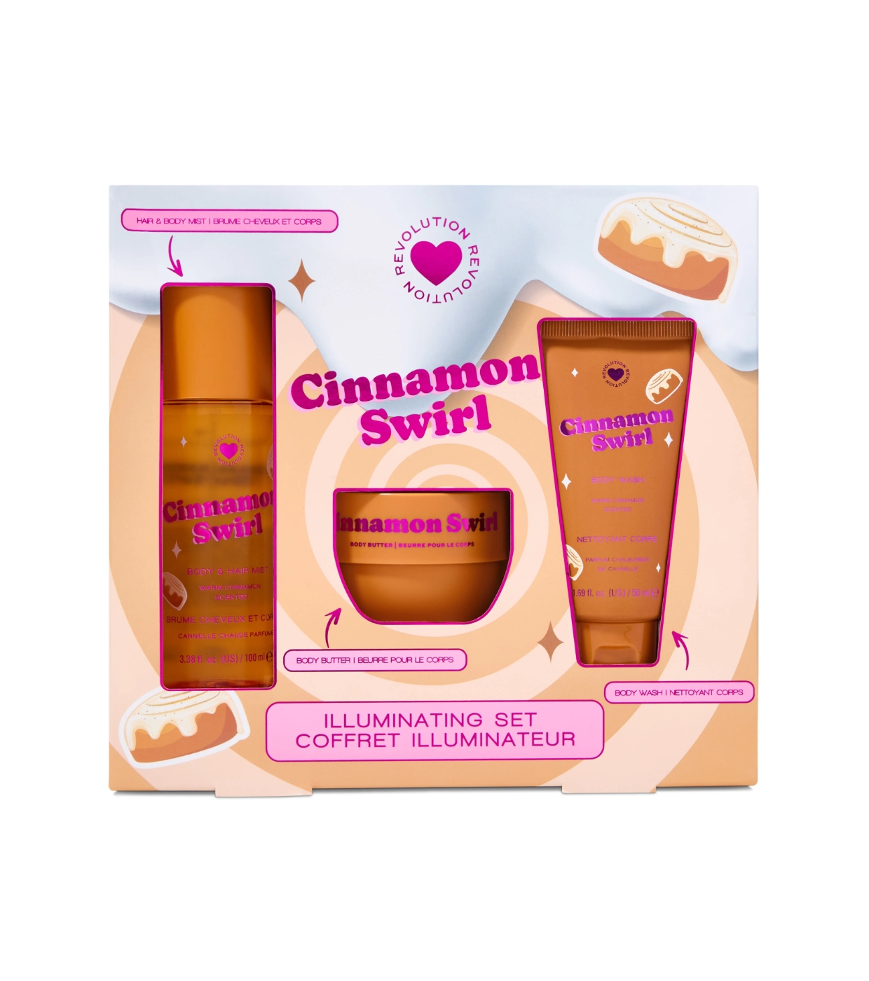 Verwöhnen Sie Ihre Haut mit dem I Heart Revolution Cinnamon Swirl Gift Set, einem Trio von Körperpflegeprodukten mit einem unwiderstehlichen Duft nach Zimt, Vanillebutter und gesalzenem Karamell.