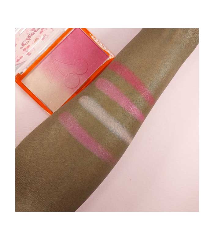 Dieses Rouge mit Farbverlauf wechselt von Babyrosa zu Beerenrosa, alle mit zwei geprägten saftigen Kirschen und einem süßen Kirschduft.