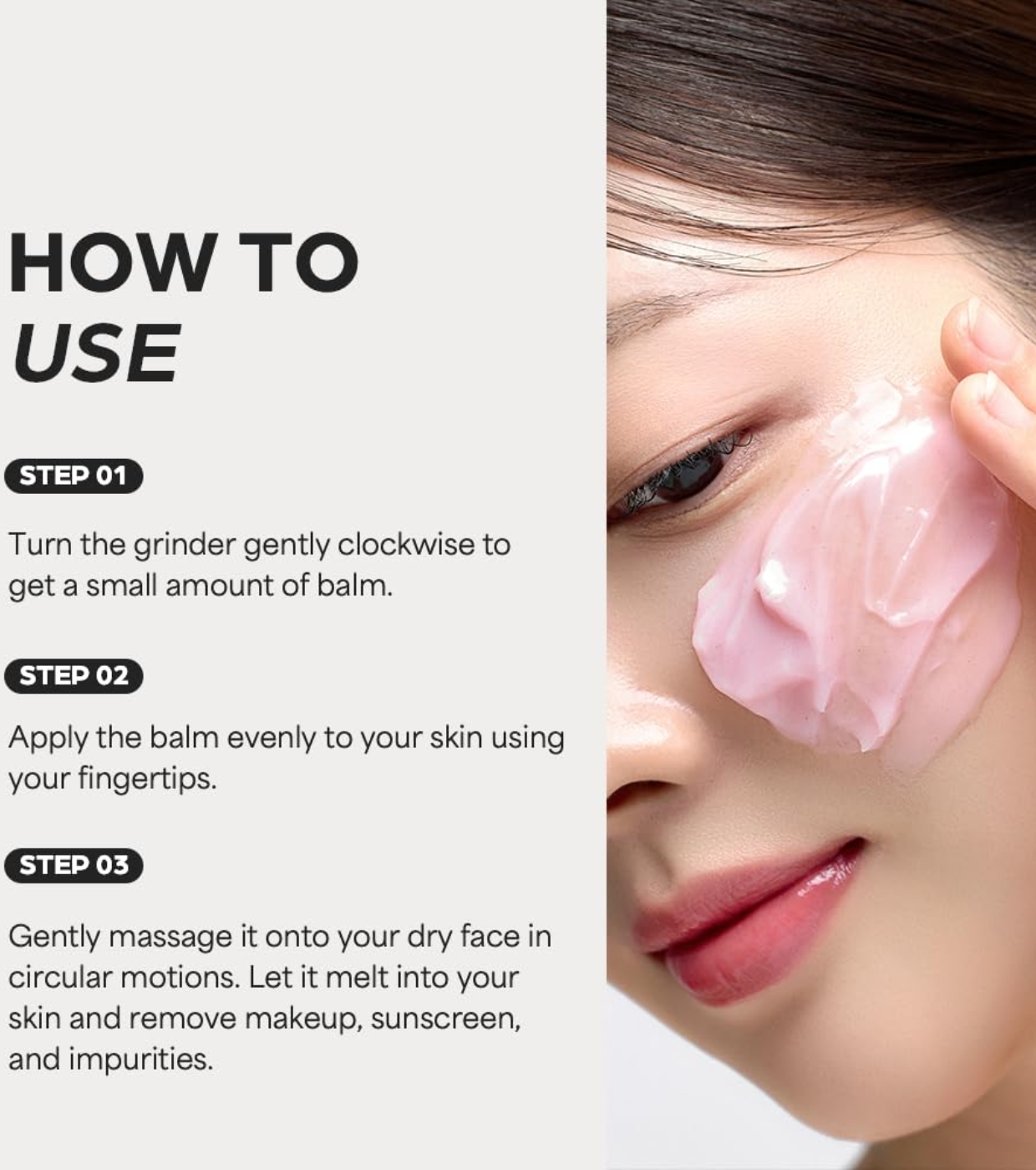 Massieren Sie den Balsam mit kreisenden Bewegungen in Ihr trockenes Gesicht ein, sodass er in Ihre Haut einzieht und Make-up, Sonnenschutzmittel und Unreinheiten löst.