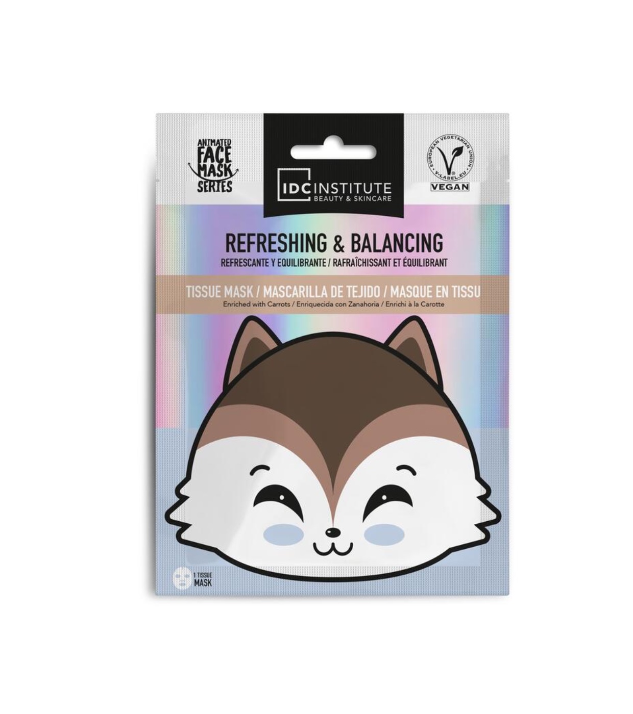 IDC Institute Die kühlende und ausgleichende Tuchmaske enthält Karottenextrakt für eine erfrischende und reinigende vegane Behandlung, die hilft, die Talgproduktion auszugleichen und überschüssiges Öl zu kontrollieren.
