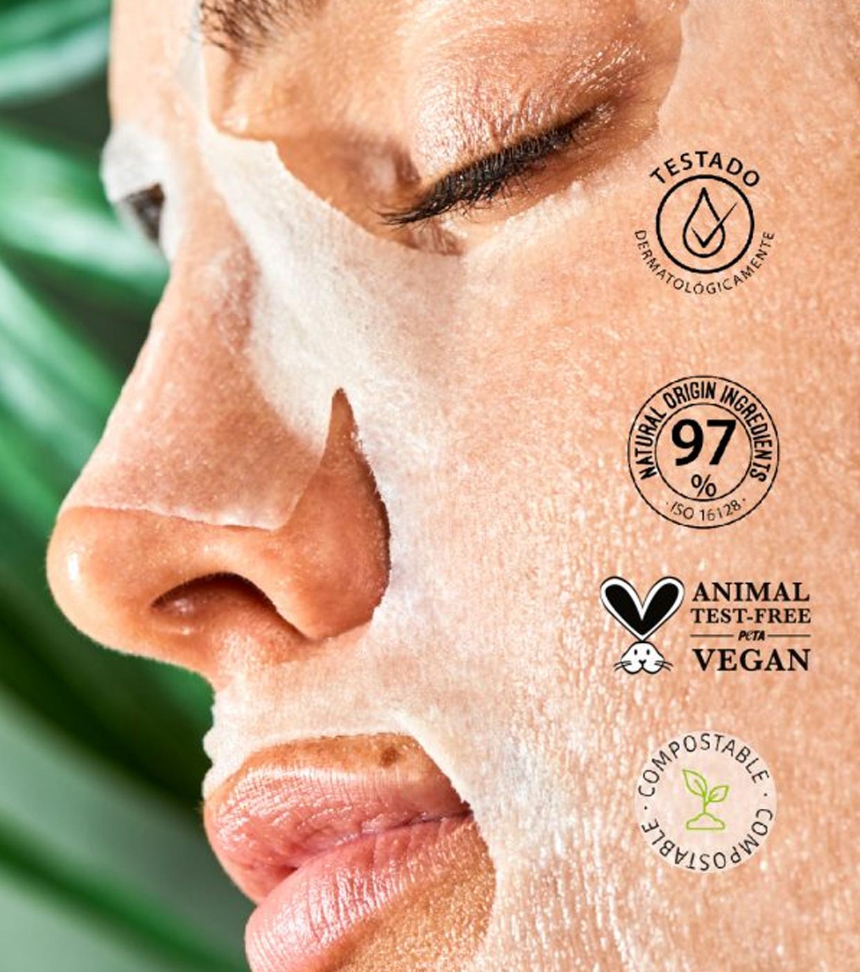 Das Material der Gewebemaske ist zu 100 % kompostierbar, enthält keine Allergene und ist zu 100 % vegan. Das dermatologisch getestete Produkt wurde von den Freiwilligen, denen es auf die Dermis aufgetragen wurde, gut vertragen.