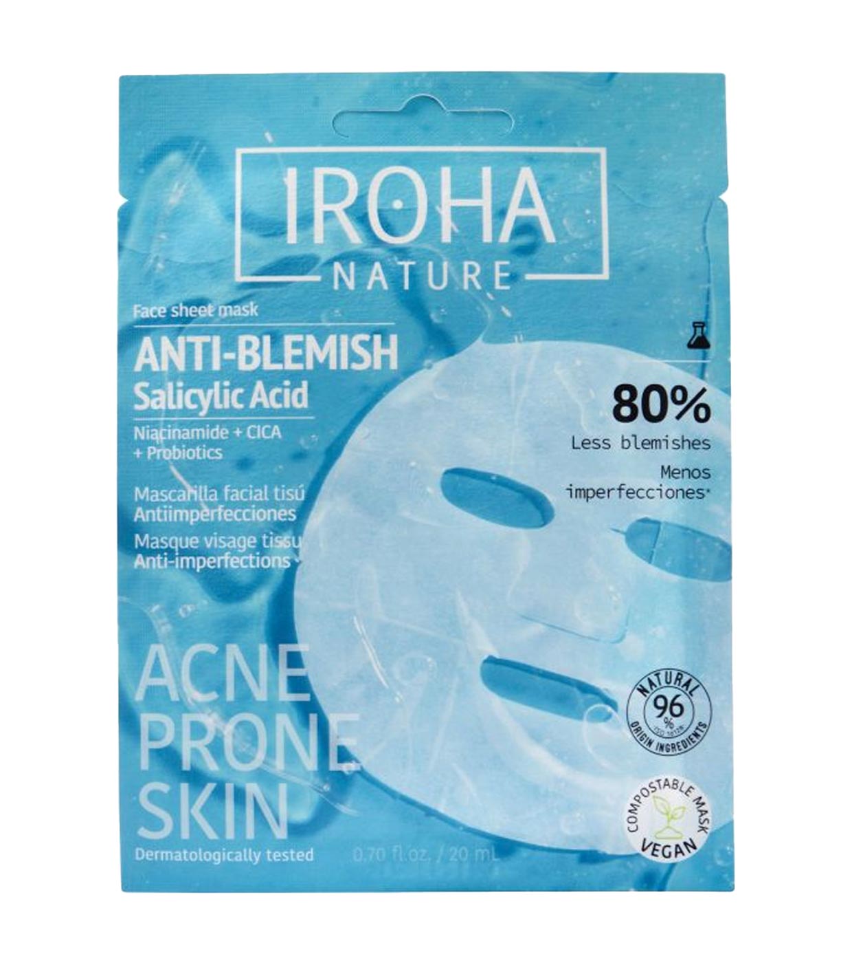 Anti-Unreinheiten-Schleier-Gesichtsmaske mit Salicylsäure, Niacinamid, CICA und Probiotika von Iroha Nature.