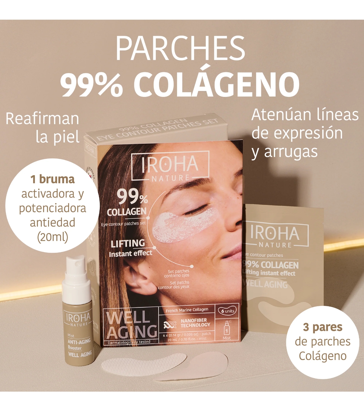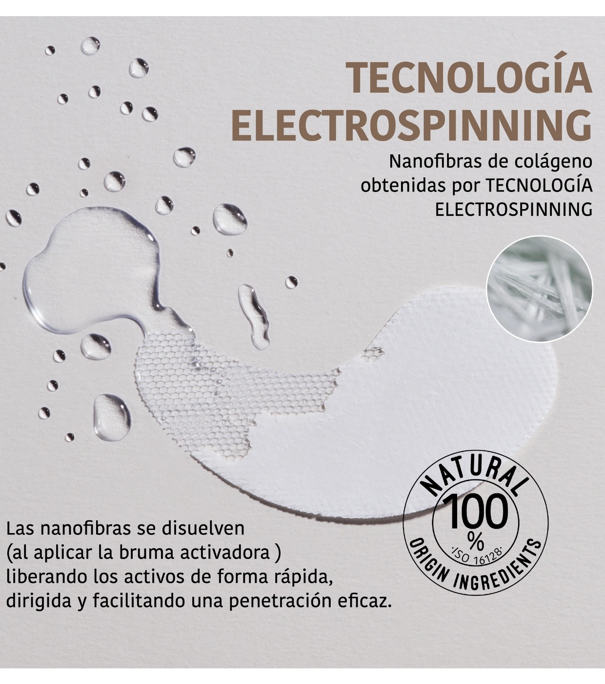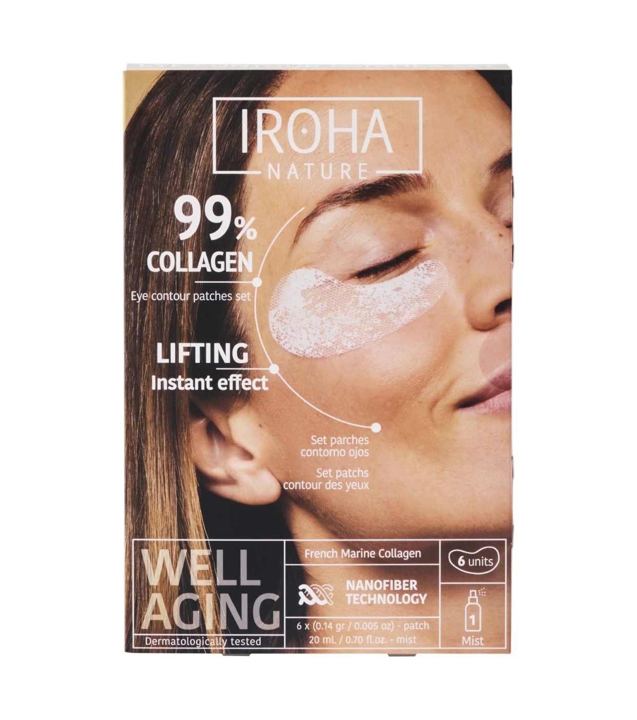 Die 99% Collagen Lifting Effect Augenkontur-Patches von Iroha Nature kombinieren innovative Elektrospinning-Technologie mit einem aktivierenden Nebel, der die Nanofasern sofort auflöst und so Kollagen direkt in die tiefsten Hautschichten freisetzt.