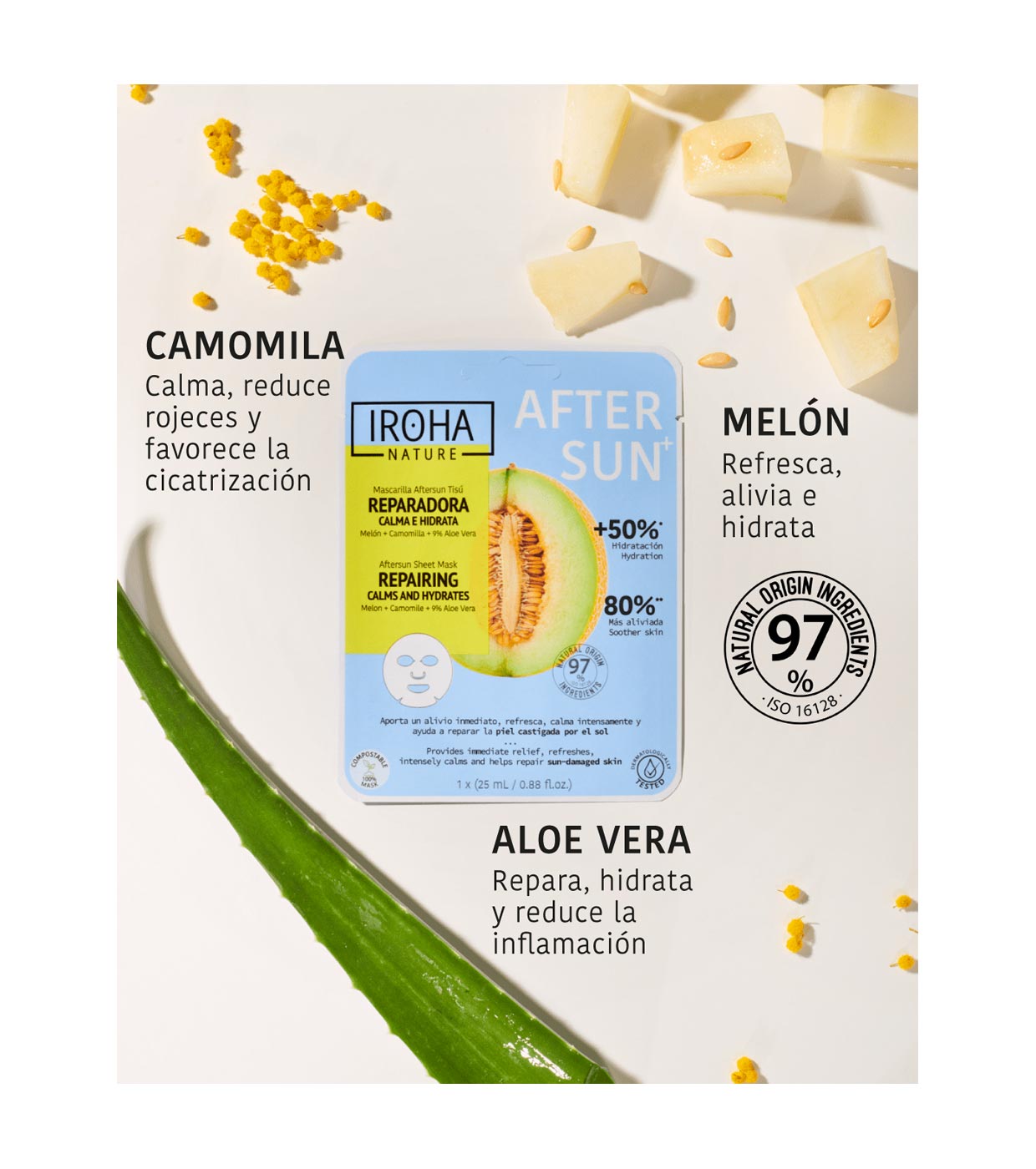 Die Iroha Nature reparierende Iroha Nature-Maske bietet sofortige Linderung, erfrischt, beruhigt intensiv und hilft bei der Reparatur sonnengeschädigter Haut.