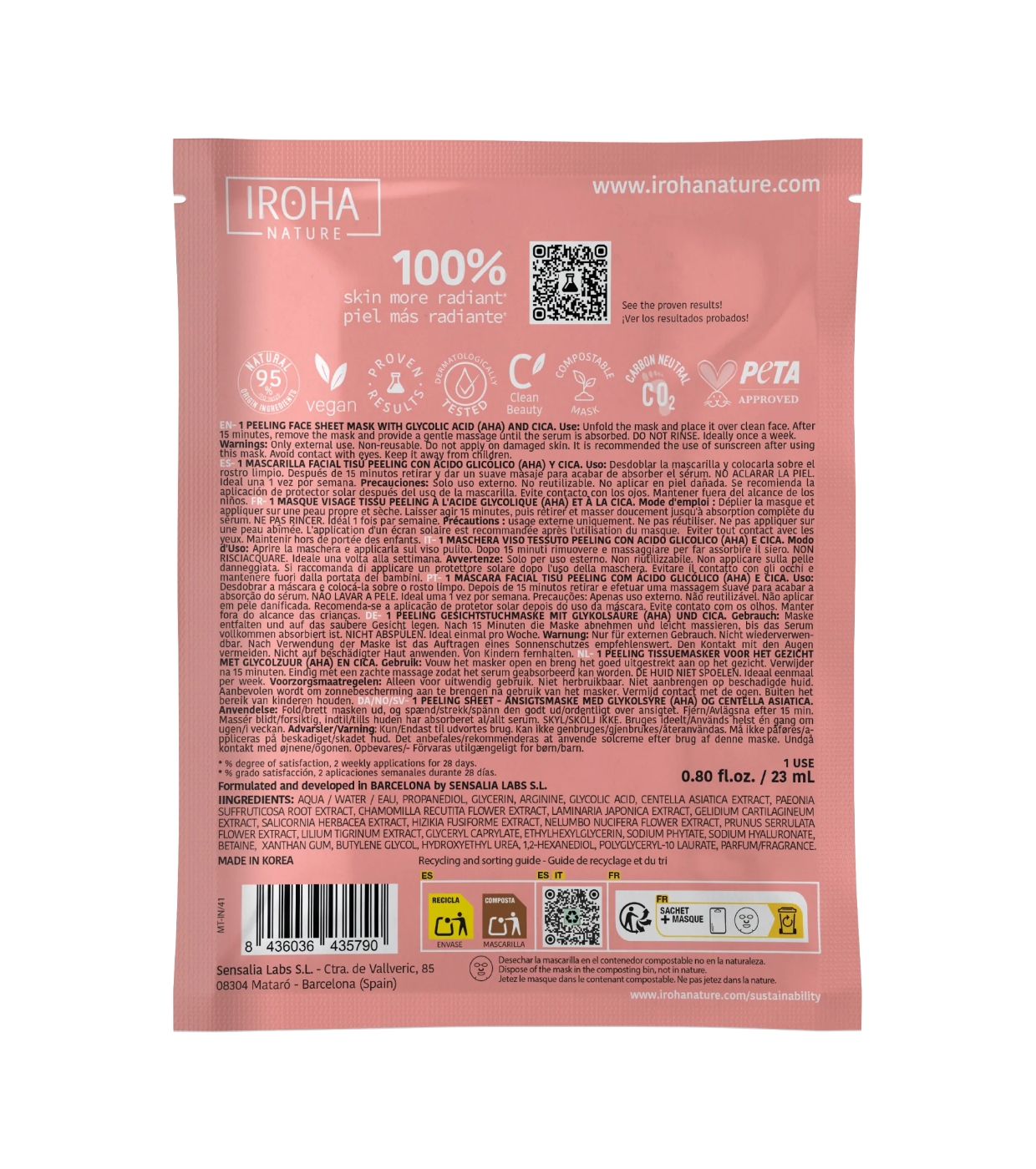 Diese Maske fördert die Hauterneuerung, ohne die Haut zu reizen oder auszutrocknen, dank der feuchtigkeitsspendenden, antioxidativen und beruhigenden Eigenschaften von Centella Asiatica.
