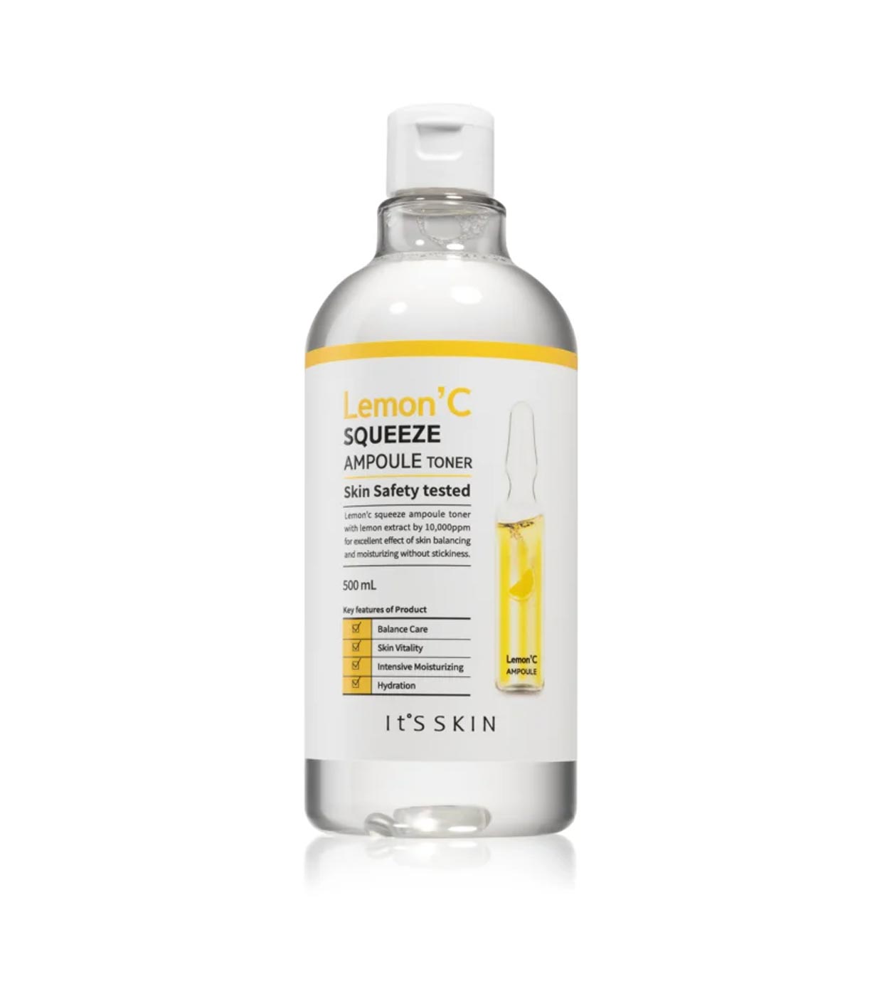 Tónico de It´s Skin Lemon C mit wässriger Konsistenz mit Zitronenextrakt und einer Mischung aus 8 Arten von Hyaluronsäure trägt zur Leuchtkraft des Gesichts und zur Reduzierung dunkler Flecken bei.