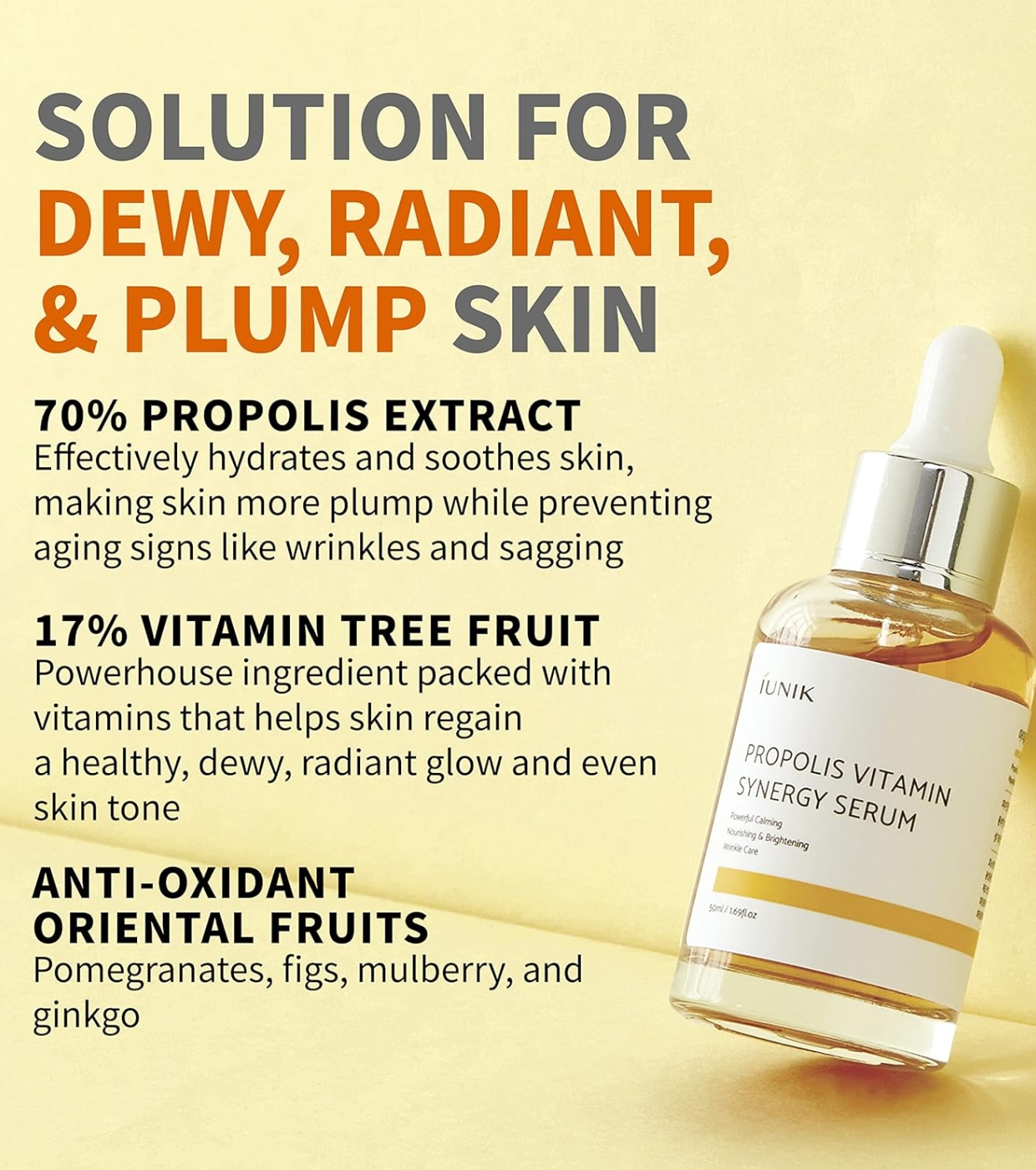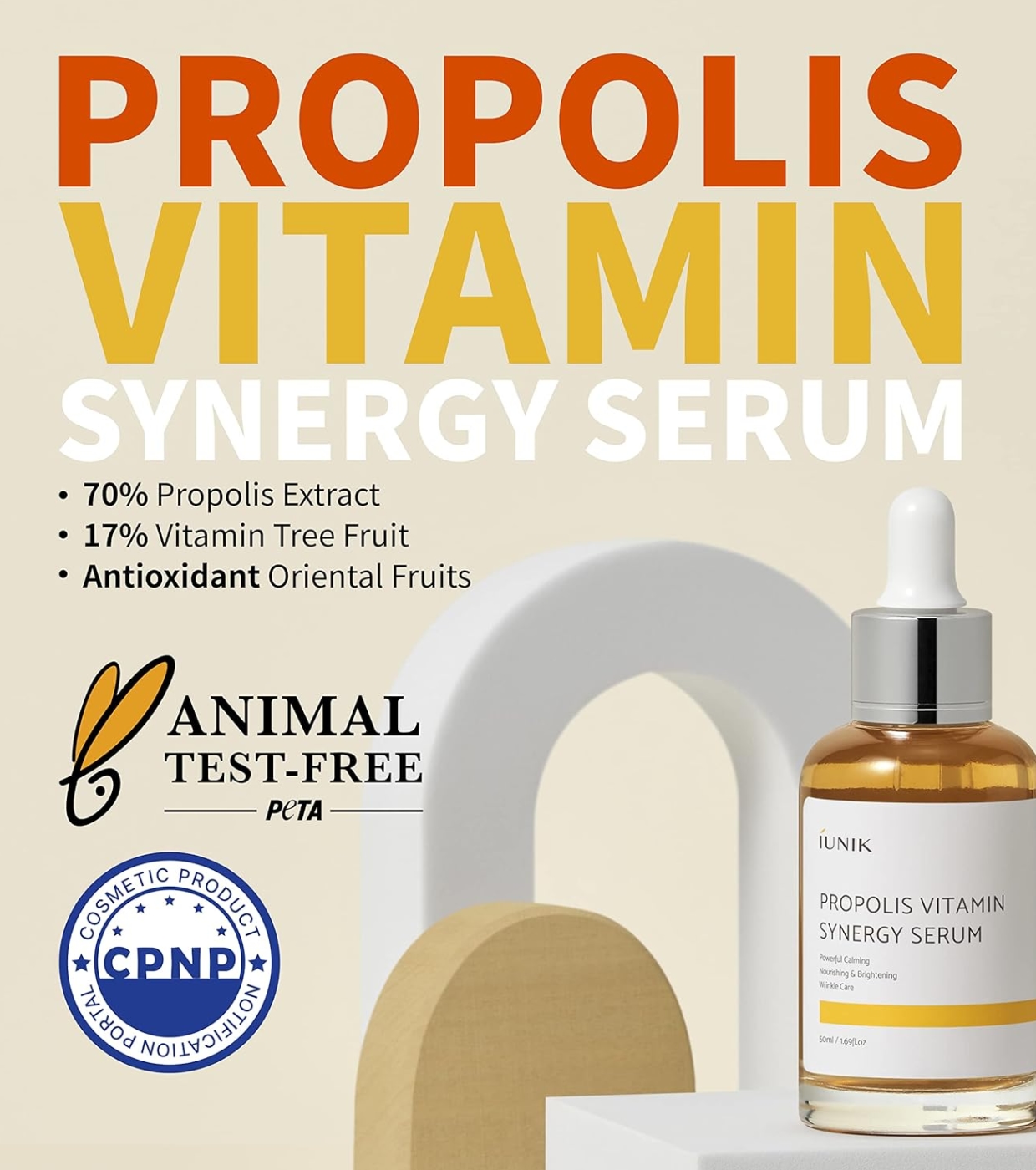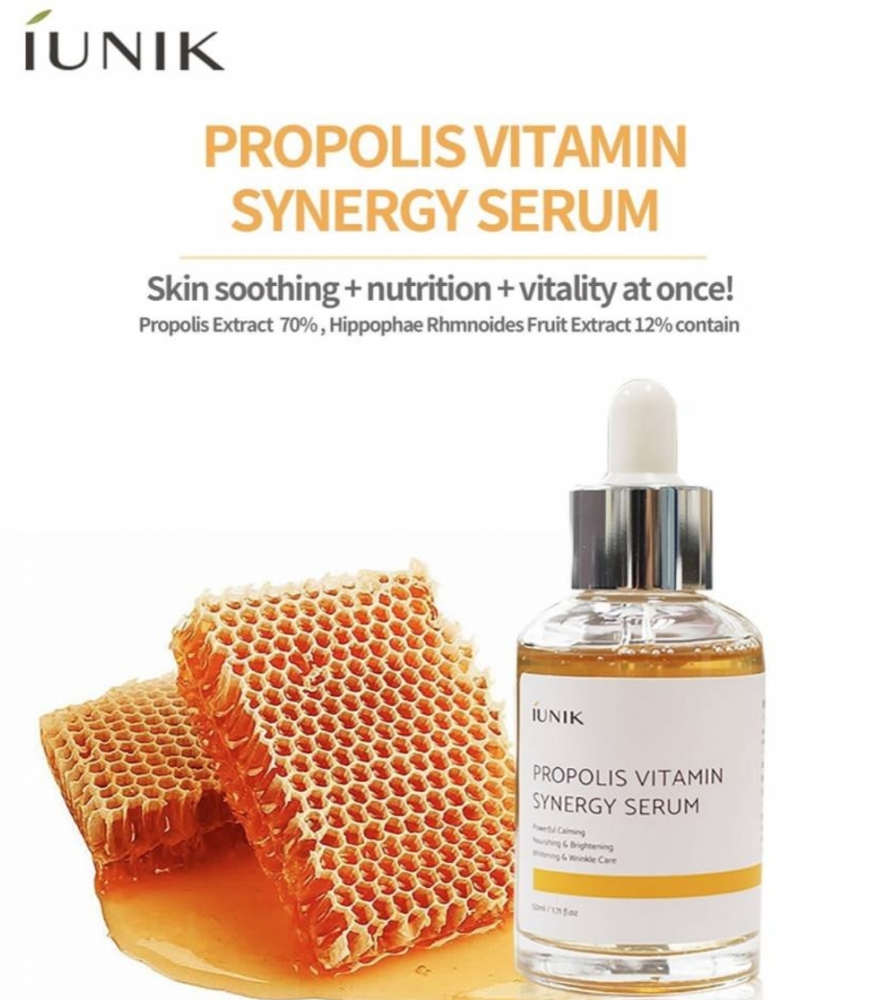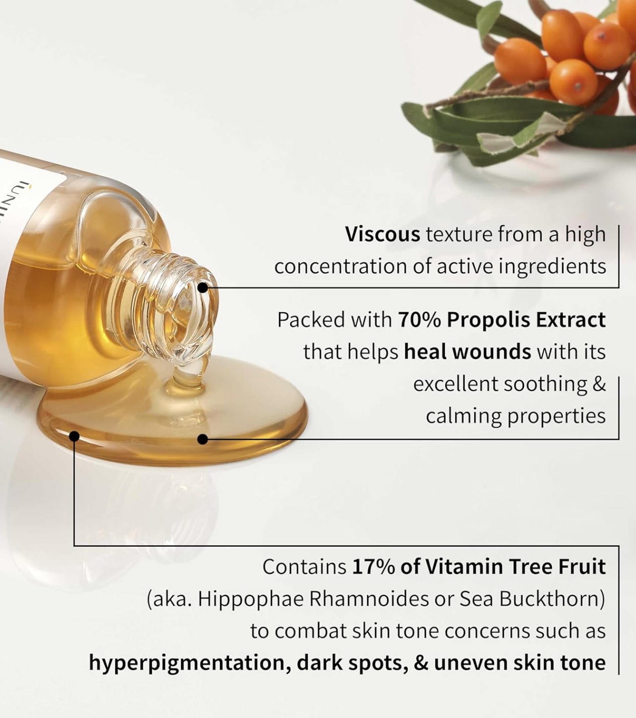 iUNIK Propolis Vitamin Synergy Serum ist ein nährendes und beruhigendes Serum mit 70 % Propolis-Extrakt und 12 % Sanddorn-Extrakt (Hippophae Rhamnoides).