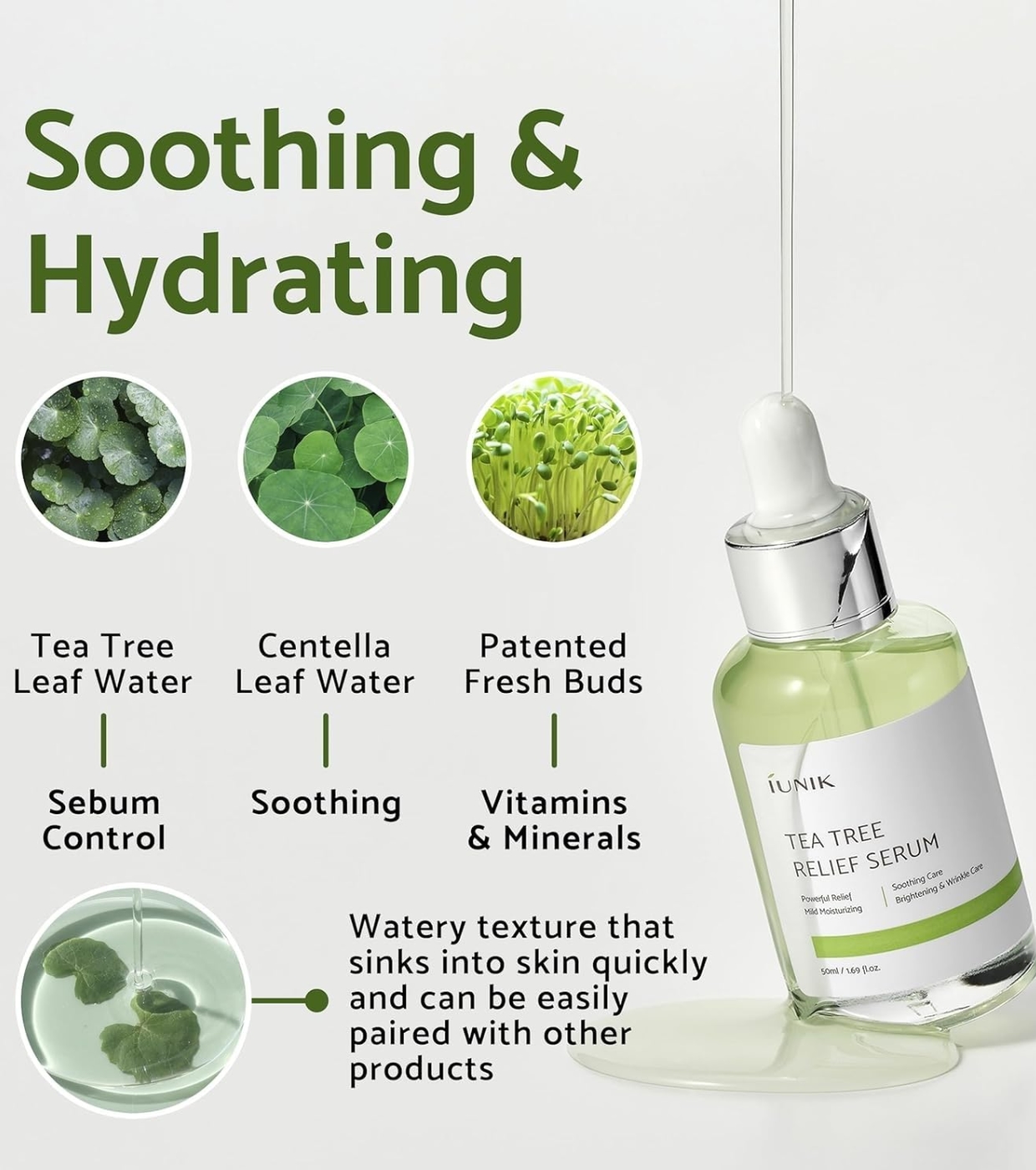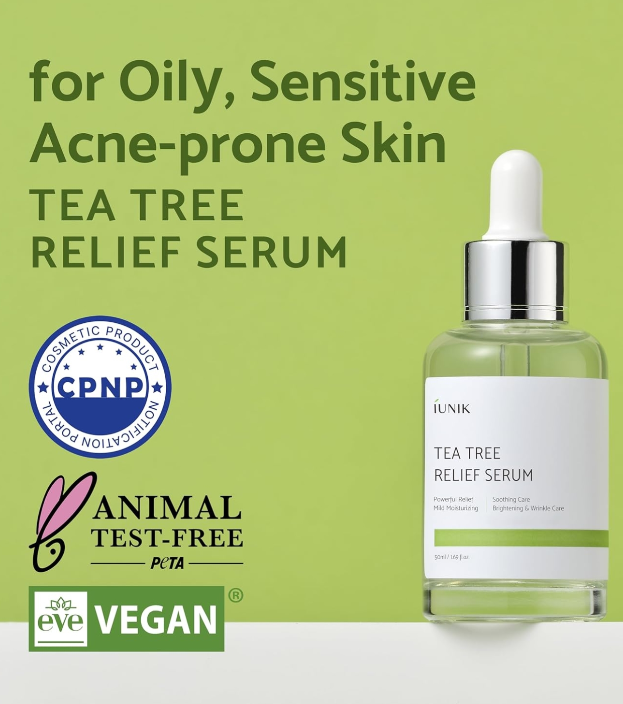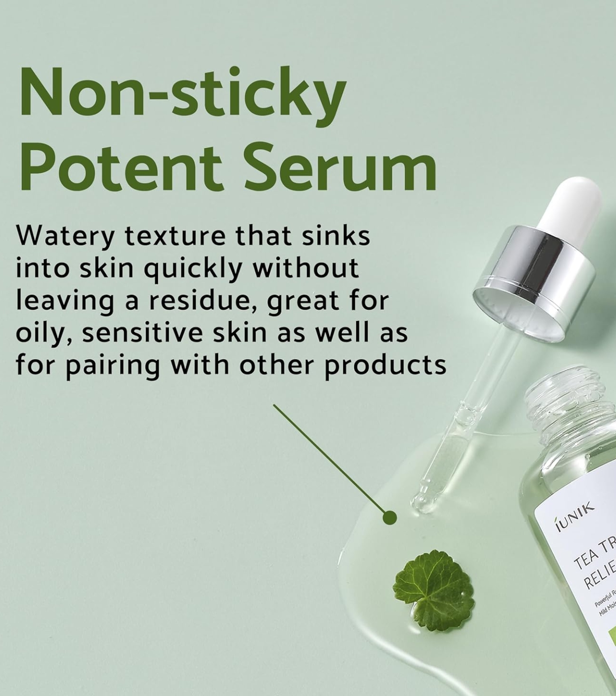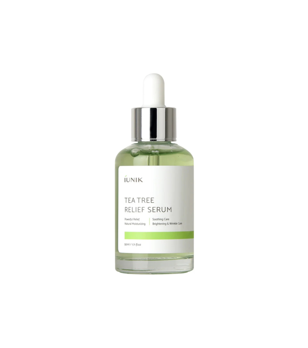 iUNIK Tea Tree Relief Serum ist ein beruhigendes und reparierendes Serum, das speziell für empfindliche, gereizte oder zu Akne neigende Haut entwickelt wurde.