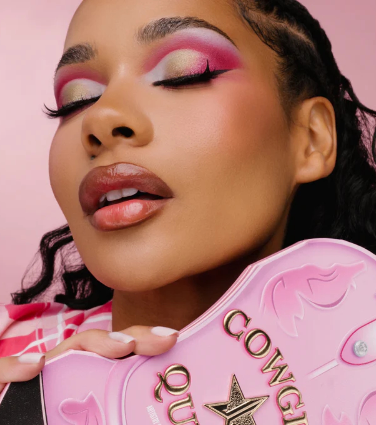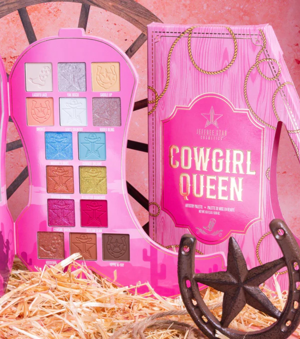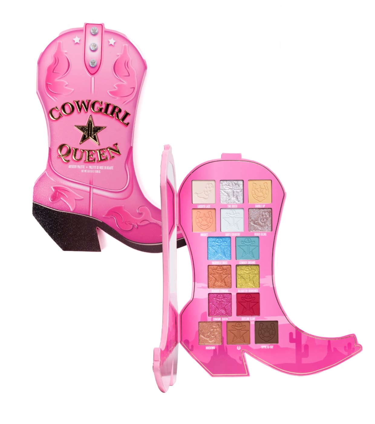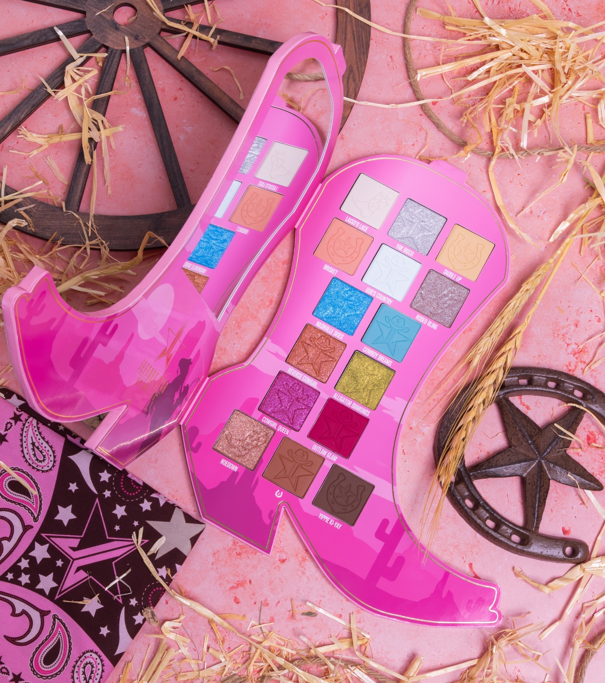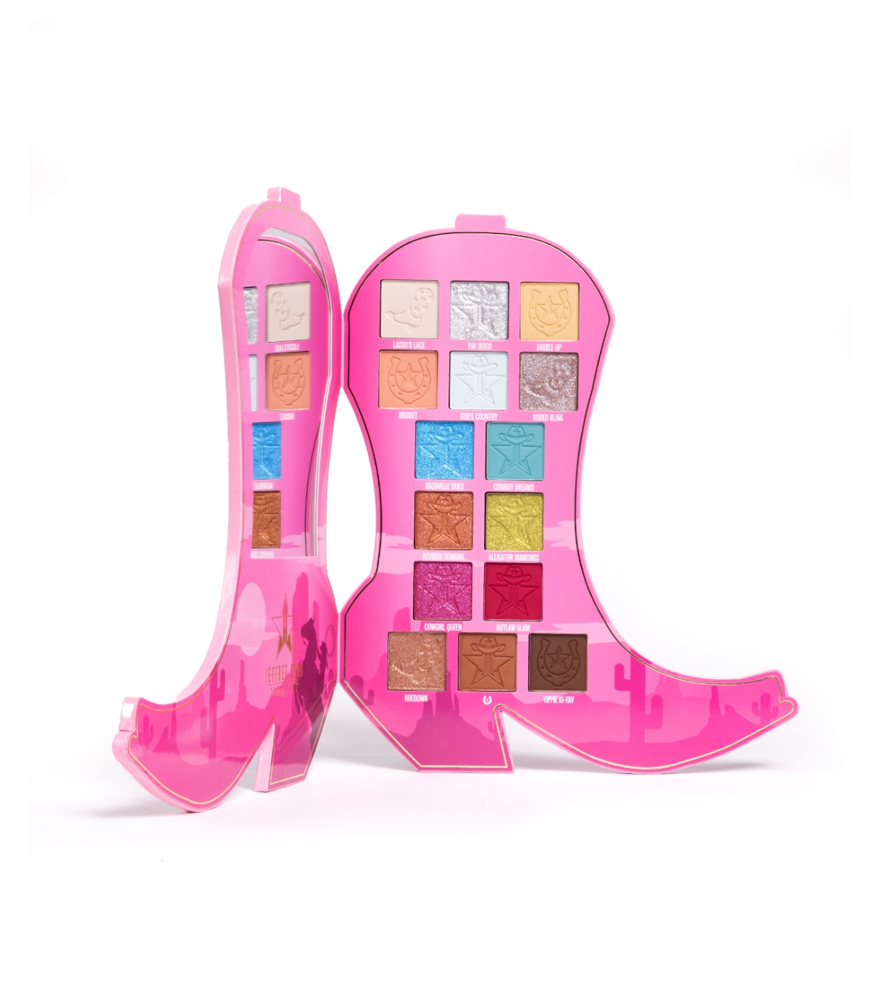 Leben Sie Ihre Cowboy Queen-Fantasie mit dieser Jeffree Star Cosmetics-Lidschattenpalette in einer einzigartigen Verpackung in Form eines rosa Cowboystiefels aus.