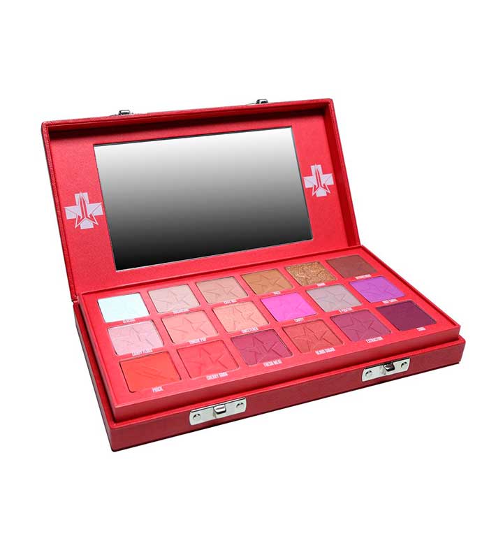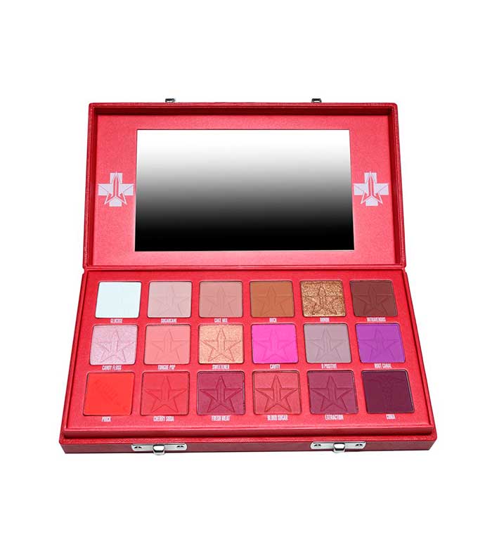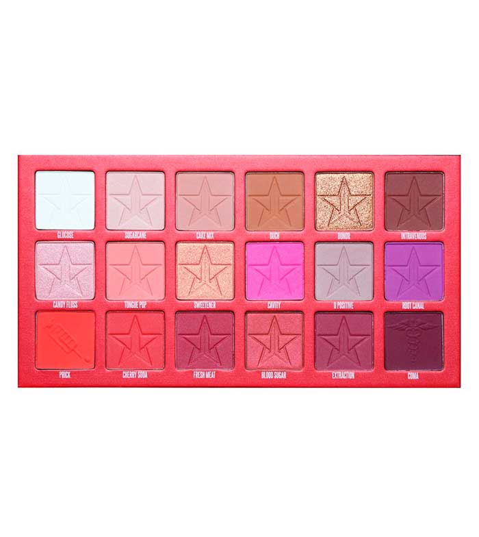 Die 'Blood Sugar' Palette von der 'Love Sick'-Kollektion enthält 18 Farbtöne von intensiven Lidschatten bis hin zu gepressten Pigmenten. Die Palette hat 3 verschiedene Finishes: matt, metallisch und gepresstes Pigment.
