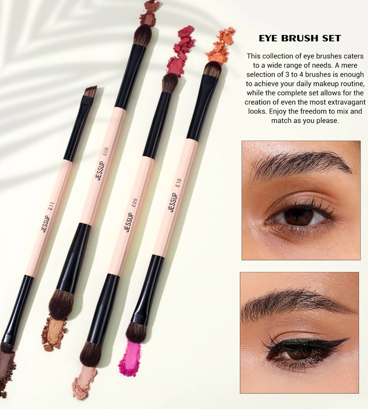 - E10 Doppelseitiger Lidschattenpinsel: Doppelseitiger Lidschattenpinsel mit zwei Borstenarten, ideal zum Auftragen von Puder- oder Creme-Lidschattenformeln.