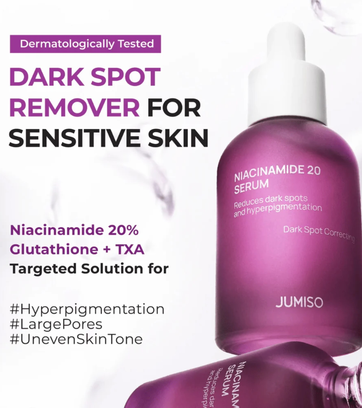 Dieses aufhellende Serum Niacinamide 20 von Jumiso kombiniert 20 % Niacinamid, Glutathion und Tranexamsäure (TXA), um bei konsequenter täglicher Anwendung in nur 2 Wochen einen klareren, gleichmäßigeren und strahlenderen Teint zu erzielen.