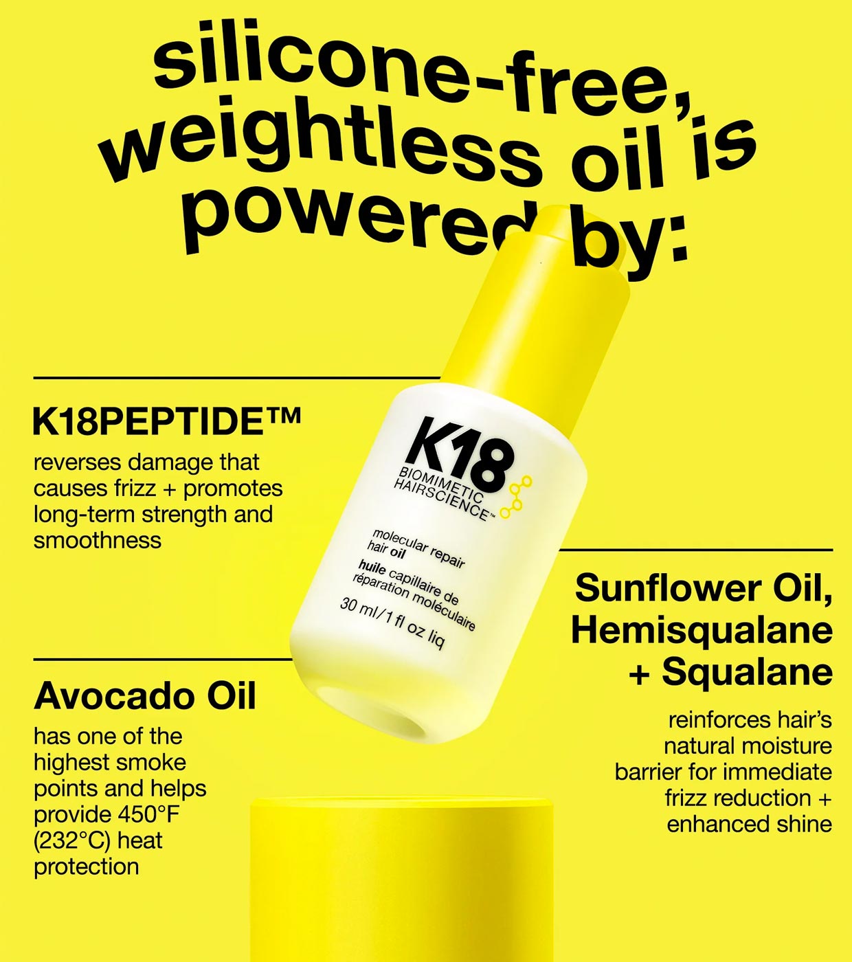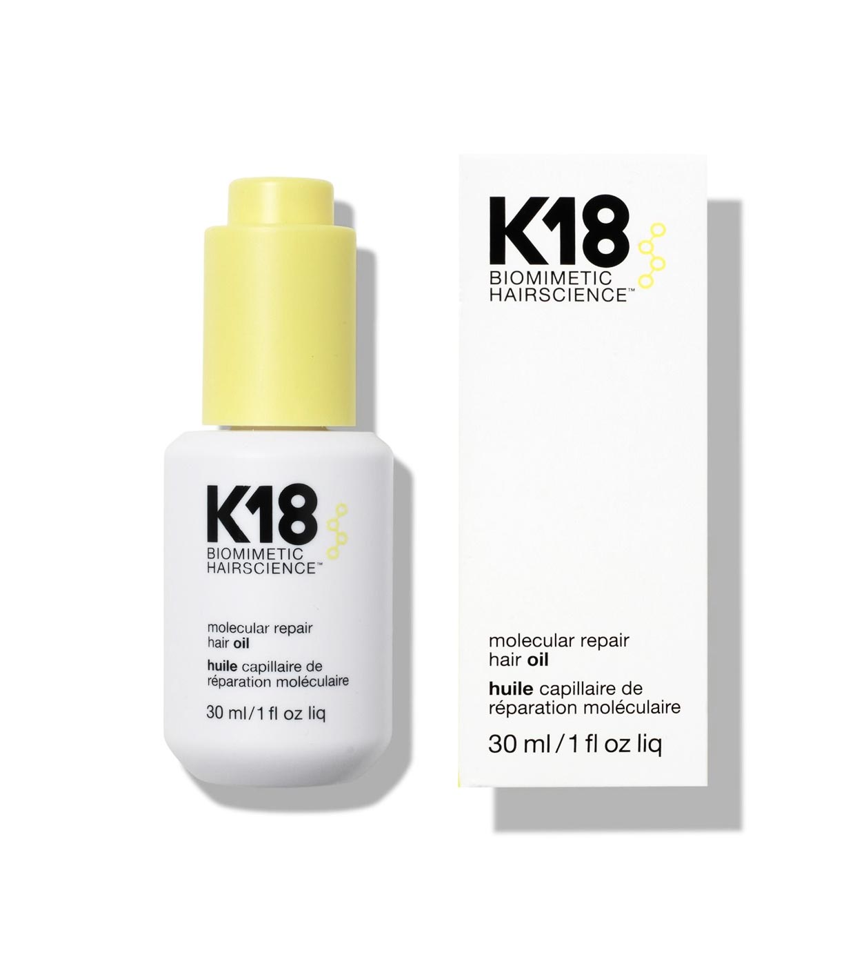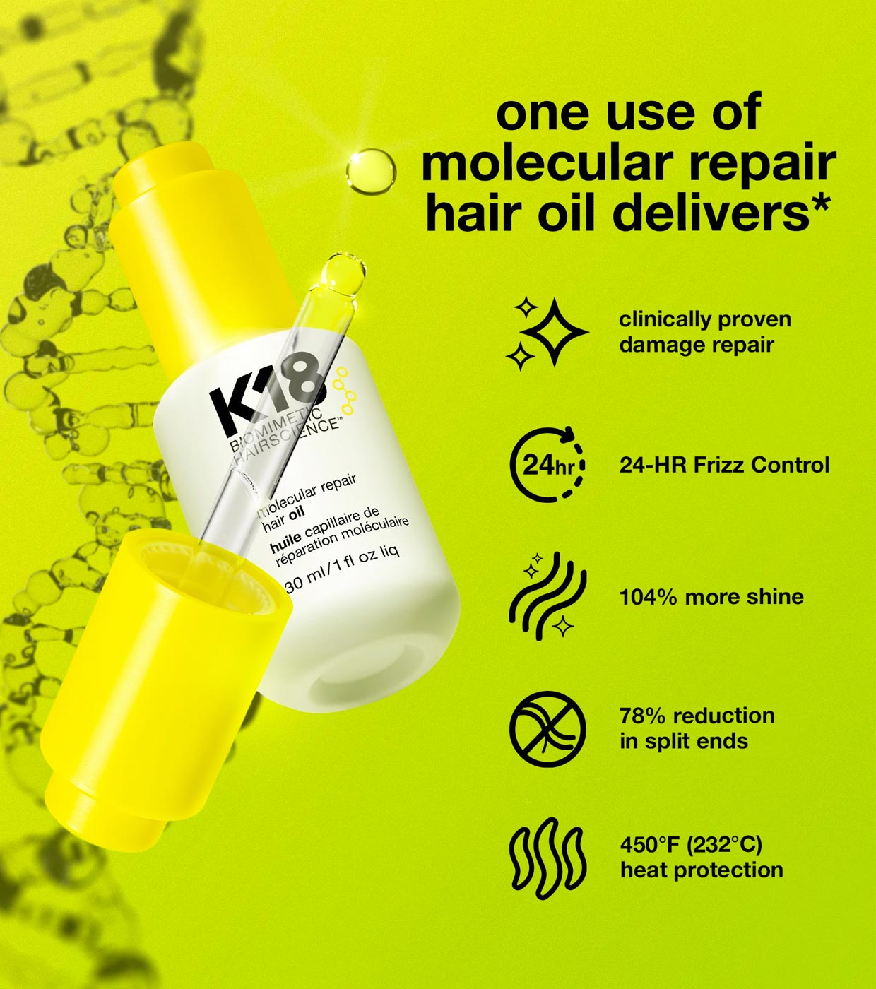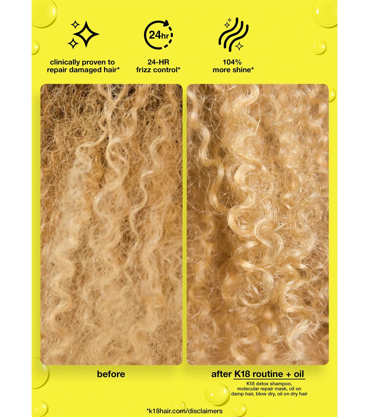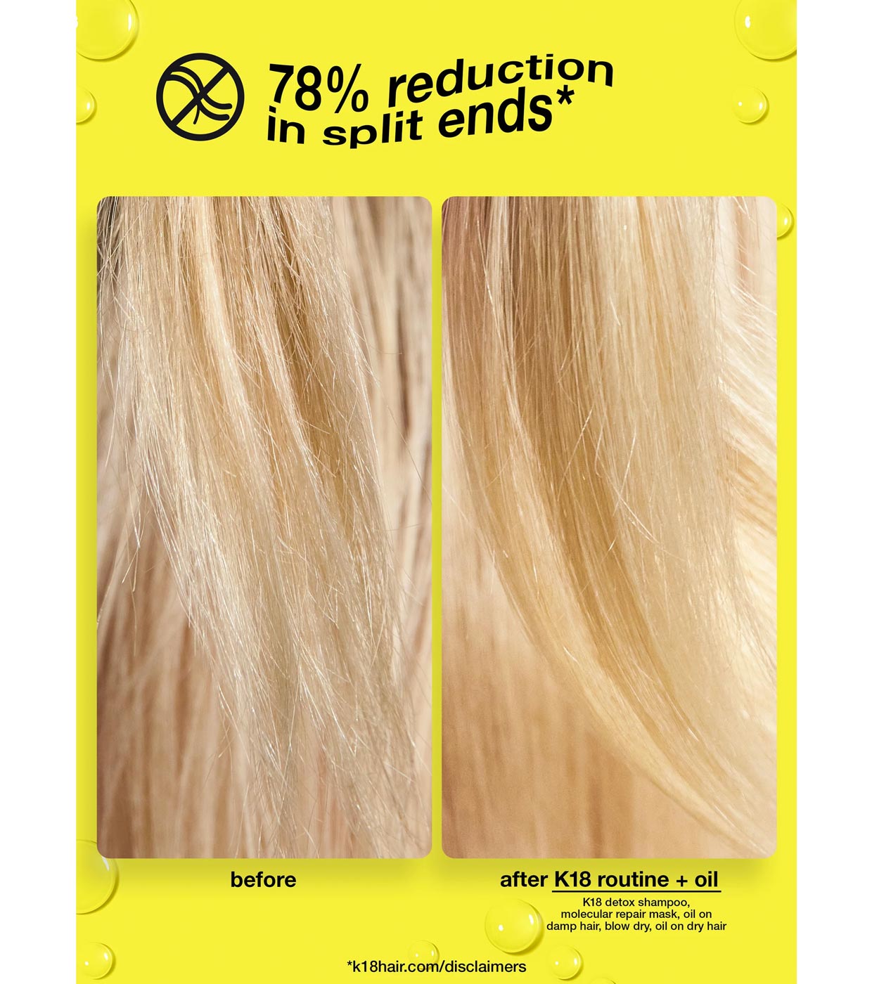 Profi-Tipp: Wenn Sie die K18 Molecular Repair Mask verwenden, tragen Sie die Maske zuerst auf das saubere, feuchte Haar auf und warten Sie 4 Minuten. Tragen Sie Molecular Repair Hair Oil auf und warten Sie 4 Minuten, um maximale Kräftigungsergebnisse zu erzielen.
