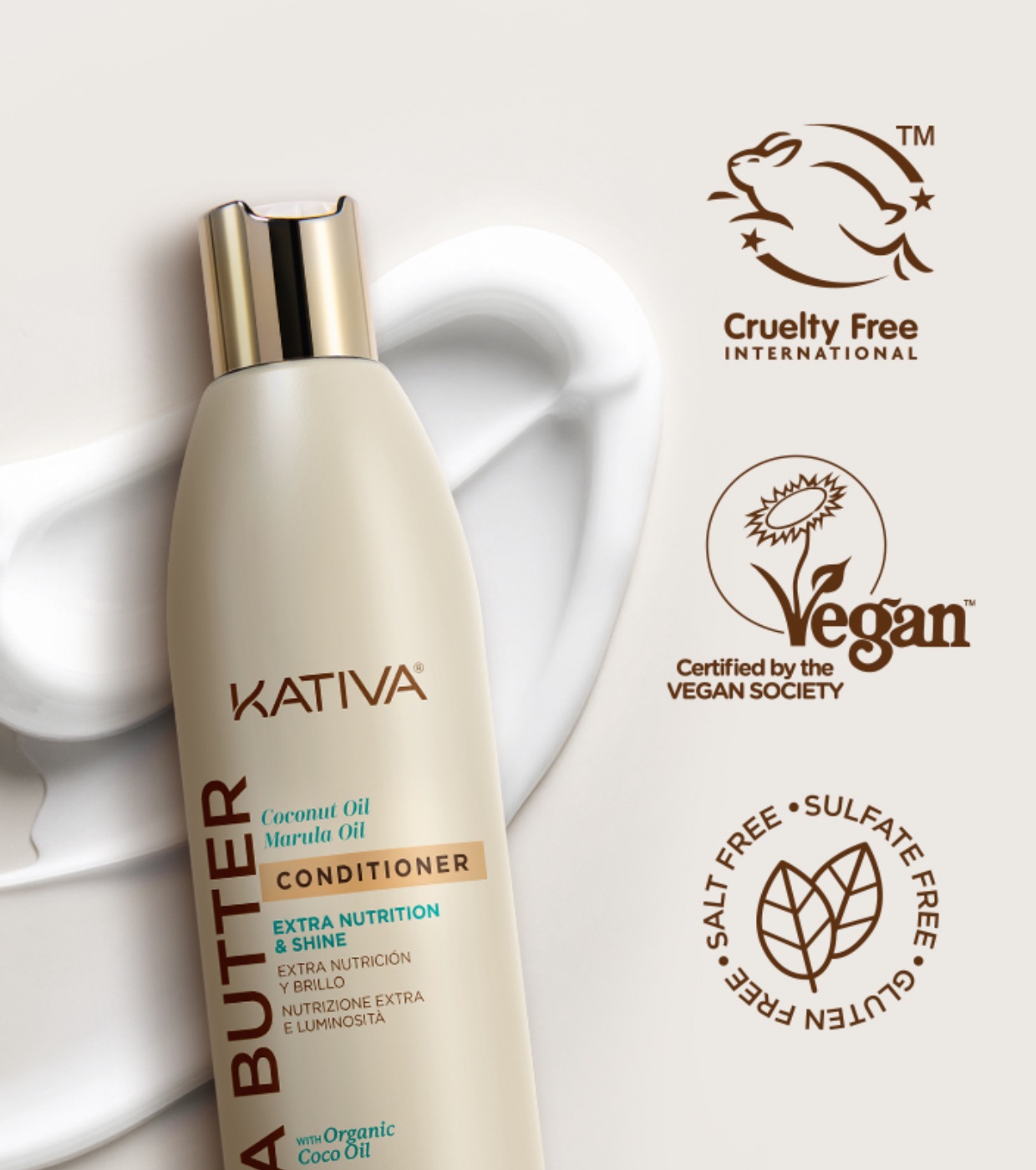 Der Kativa Shea Butter, Coconut Oil & Marula Conditioner wurde entwickelt, um stumpfes, geschädigtes Haar intensiv zu nähren und ihm neuen Glanz zu verleihen.