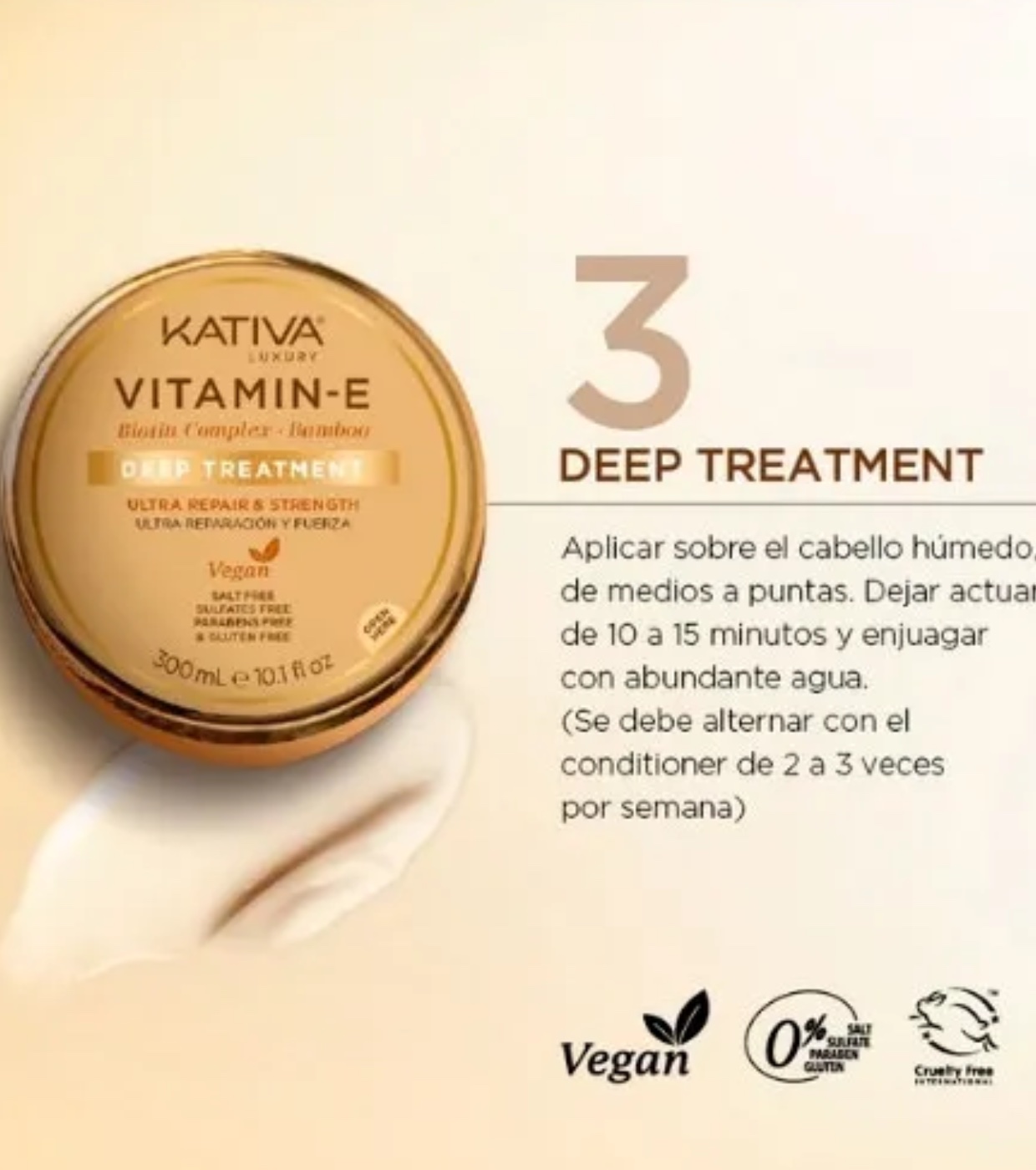 Die Maske von Kativa mit Vitamin E, Biotin-Komplex und Bambus wurde entwickelt, um das Haar zu reparieren, zu stärken und vor den Auswirkungen von Zeit, Stress und Sonneneinstrahlung zu schützen – Faktoren, die zu einem Verlust von Vitalität und Glanz führen.