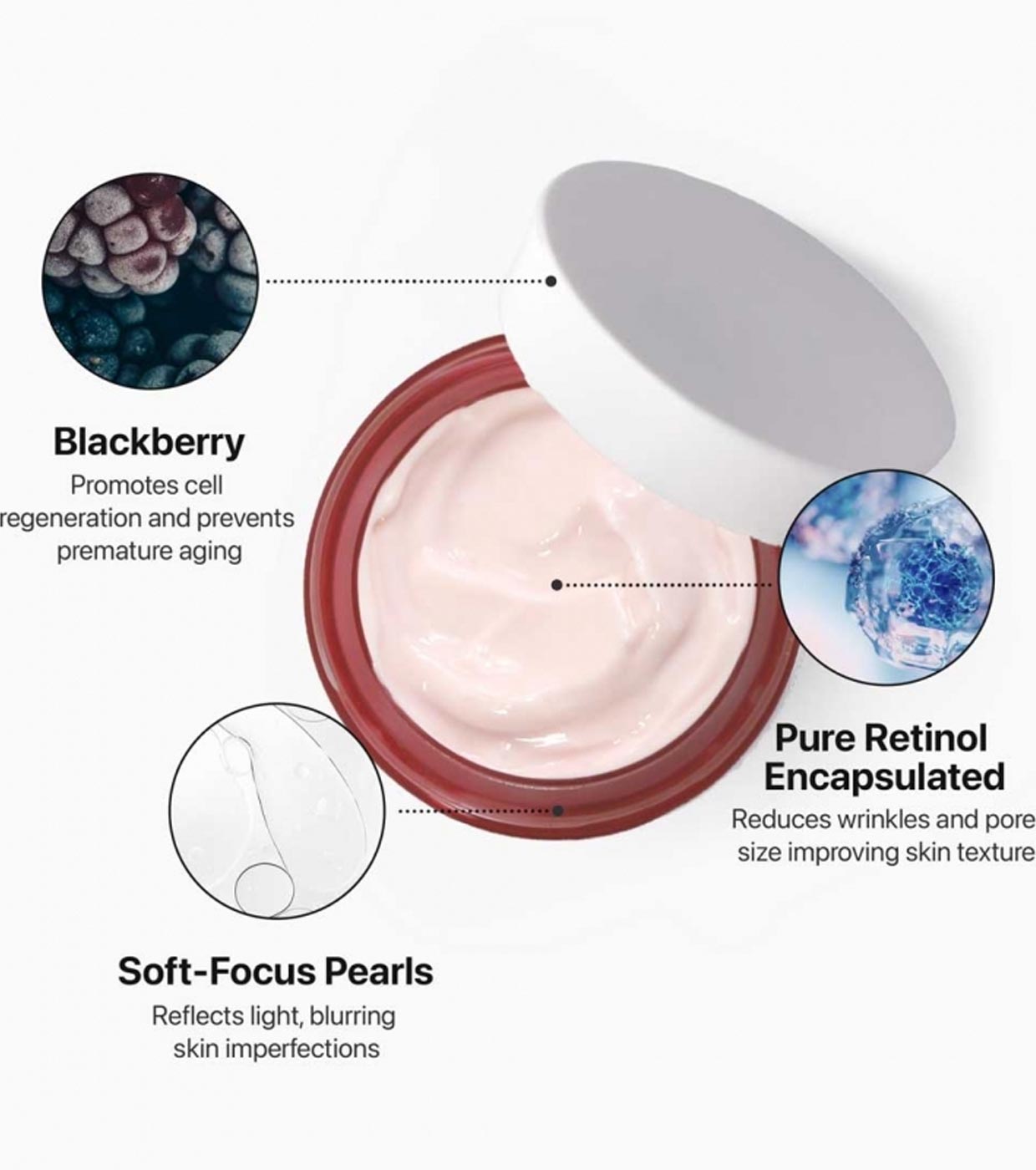 Eine einzigartige Formel mit reinem verkapseltem Retinol, Brombeerextrakt, Squalan, Soft-Focus-Perlen und Anti-Pollution Shield.