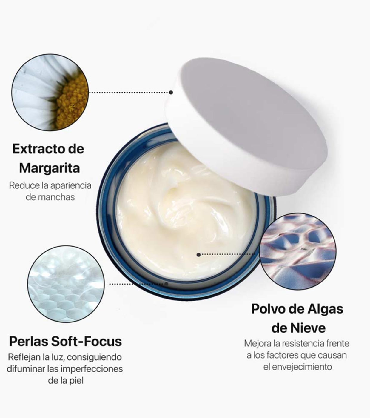 Eine einzigartige Formel mit Schneealgenpulver, Gänseblümchen, Sheabutter, Soft-Focus-Perlen und Anti-Pollution Shield.