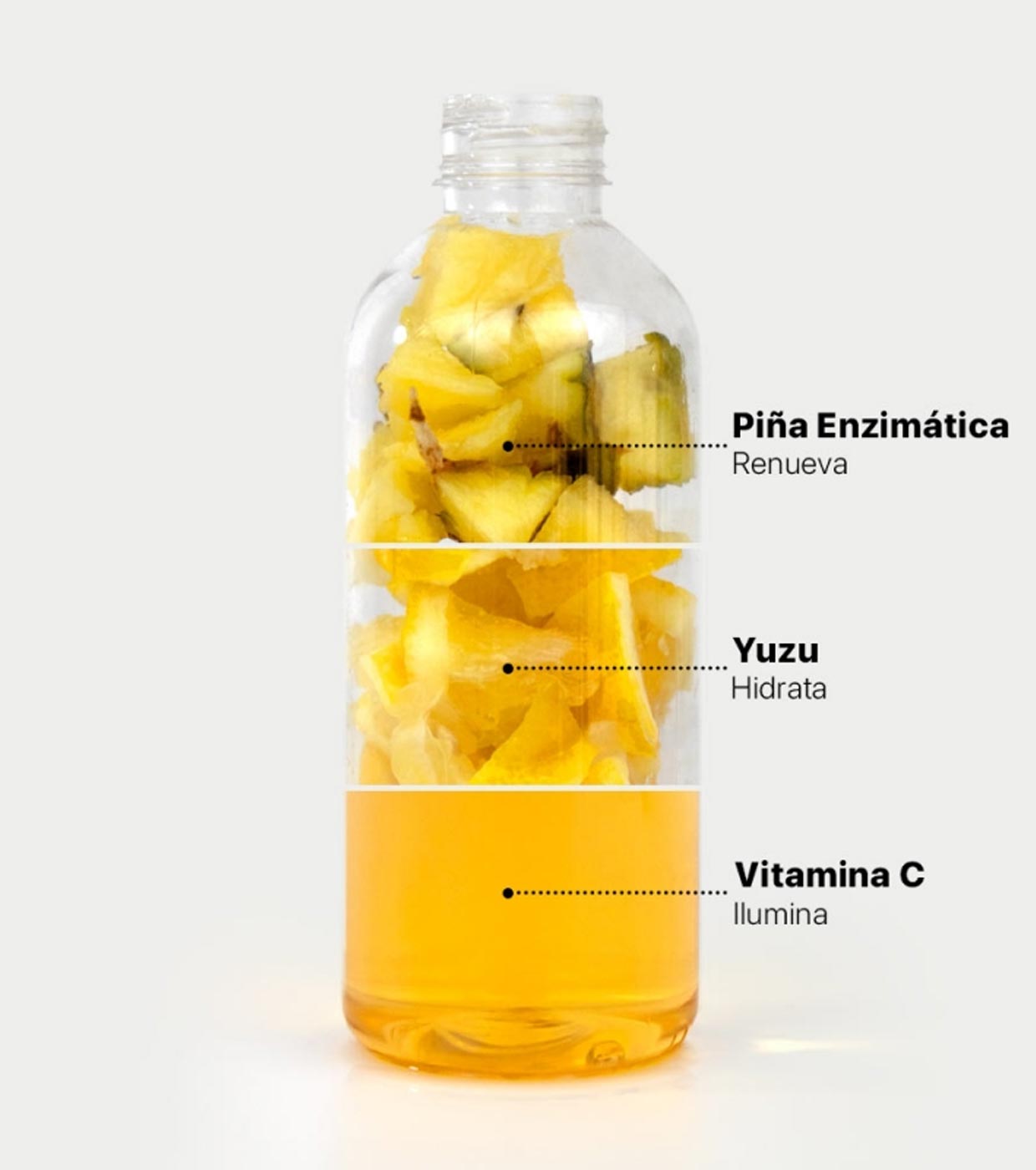 Enthält Inhaltsstoffe wie enzymatische Ananas, die für ihre erhellende und erneuernde Wirkung bekannt ist, Yuzu, das dabei hilft, die Feuchtigkeit wiederherzustellen, und Vitamin C, das die Haut erhellt und revitalisiert.