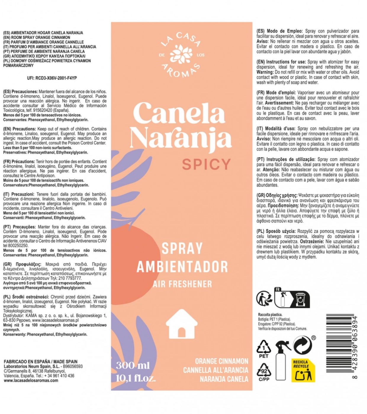 Verwandeln Sie jede Ecke Ihres Zuhauses in eine Oase der Frische mit dem Lufterfrischerspray Canela Naranja von La Casa de los Aromas , Ihrem besten Verbündeten für die Schaffung gemütlicher und lebendiger Umgebungen.