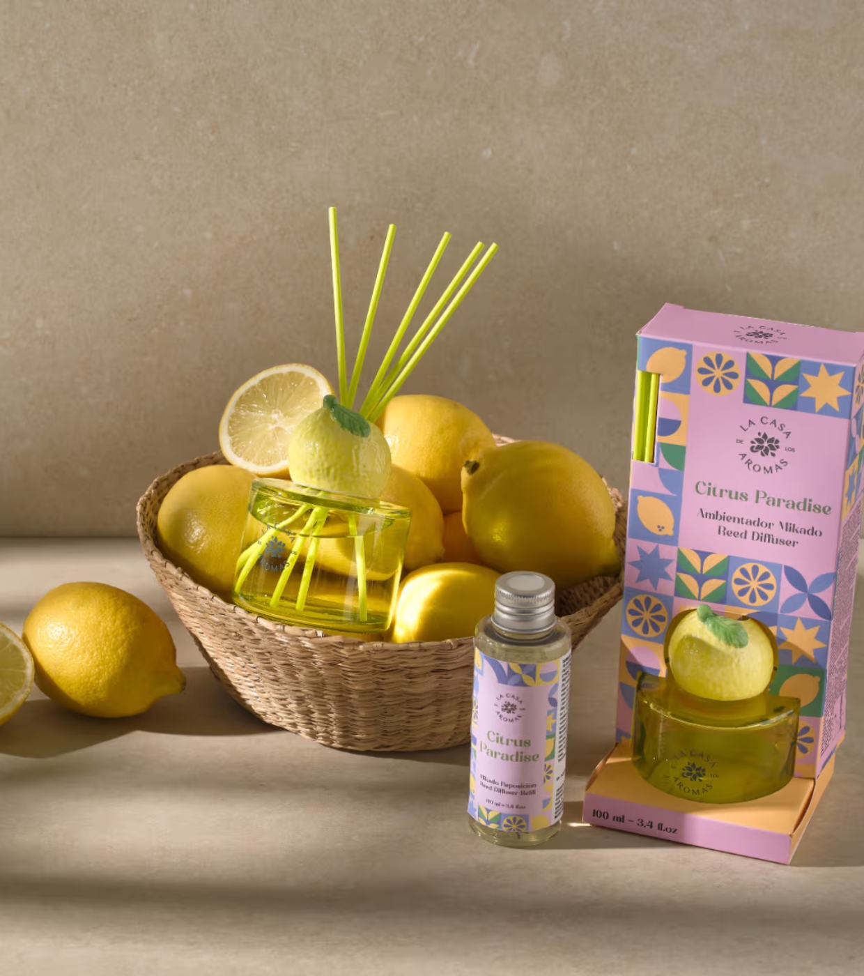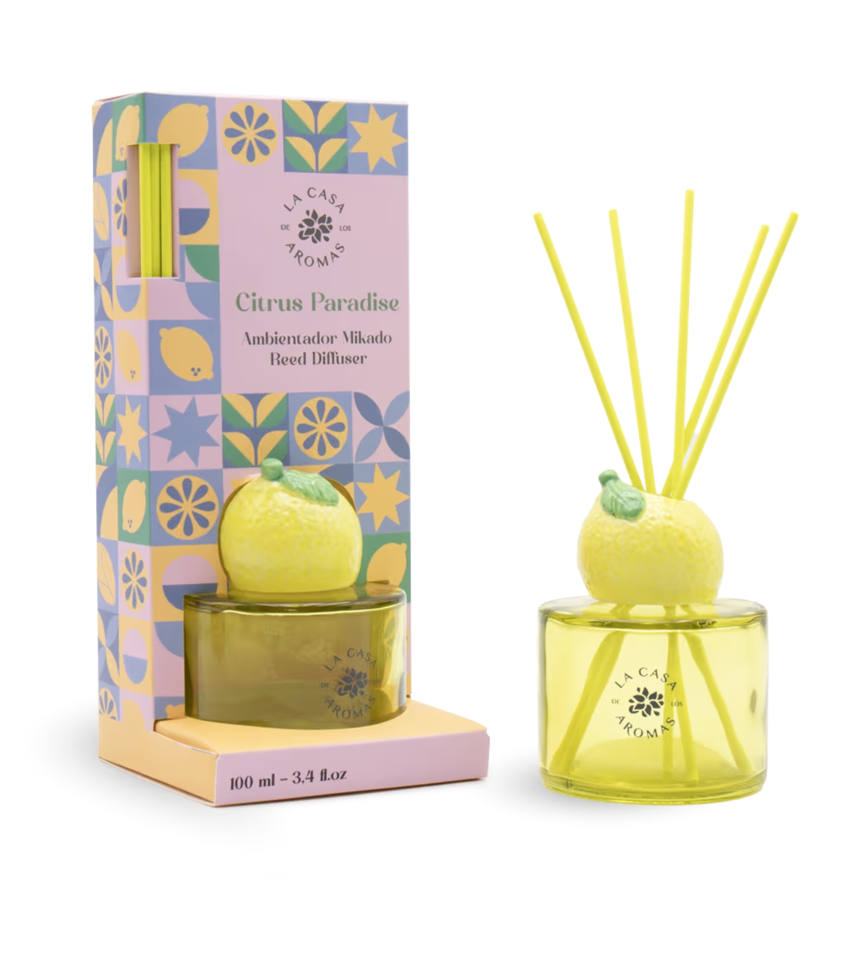 Bringen Sie Frische und Helligkeit in Ihr Zuhause mit Citrus Paradise von La Casa de los Aromas , einem dekorativen Raumduft-Diffusor mit Vintage-Inspiration.