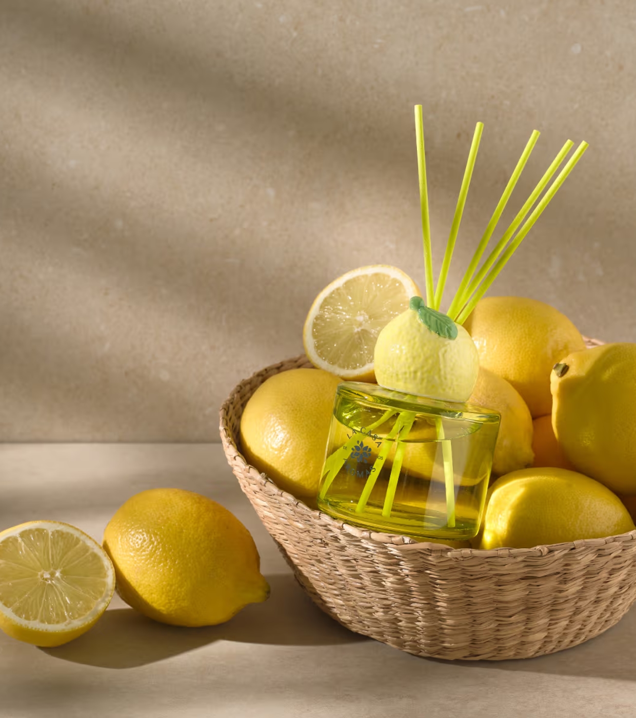 Es ist Teil der Fruity-Kollektion, einer Linie, die das Zuhause mit Farbe, Frische und Vitalität erfüllt – dank dekorativer Raumduftstäbchen mit Vintage-Ästhetik und hellen, vertrauten Fruchtaromen.