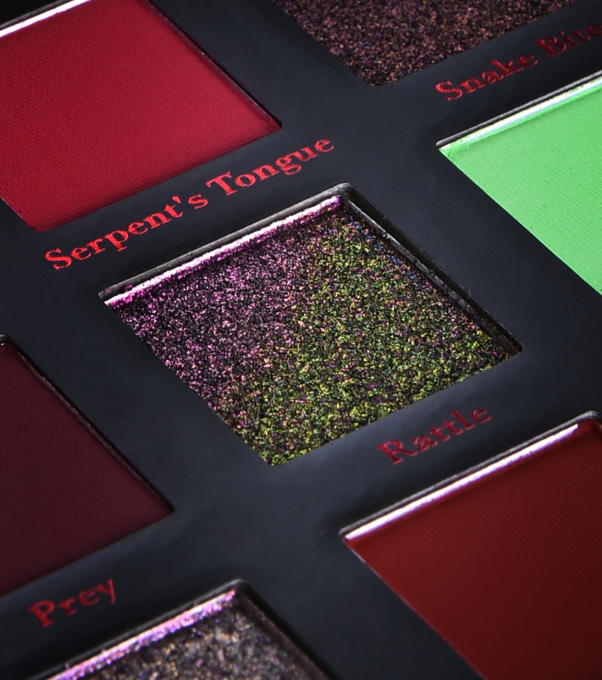 Sidewinder, Serpent’s Tongue, Scales, Prey, Hiss, Paralysis, Cold Blood, Feral, Garden of Eden Ingredients: Mica, Synthetic Fluorphlogopite, Silica, Aluminum Starch Octenylsuccinate, Magnesium Myristate, Magnesium Stearate, Caprylic/Capric Triglyceride, Ethylhexyl Palmitate, Cetyl Ethylhexanoate, Dimethicone, Polybutene, Aluminum Hydroxide, Phenoxyethanol, Caprylyl Glycol, Ethylhexylglycerin, Tocopheryl Acetate.