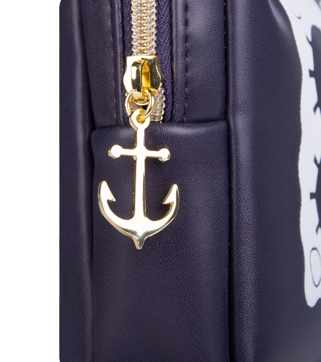 Der goldene, ankerförmige Reißverschlussanhänger verleiht dem Ganzen eine maritime Note, während das blaue Satinfutter mit SpongeBob-Motiv dafür sorgt, dass Ihr Make-up im authentischen Unterwasser-Stil ordentlich aufbewahrt wird.