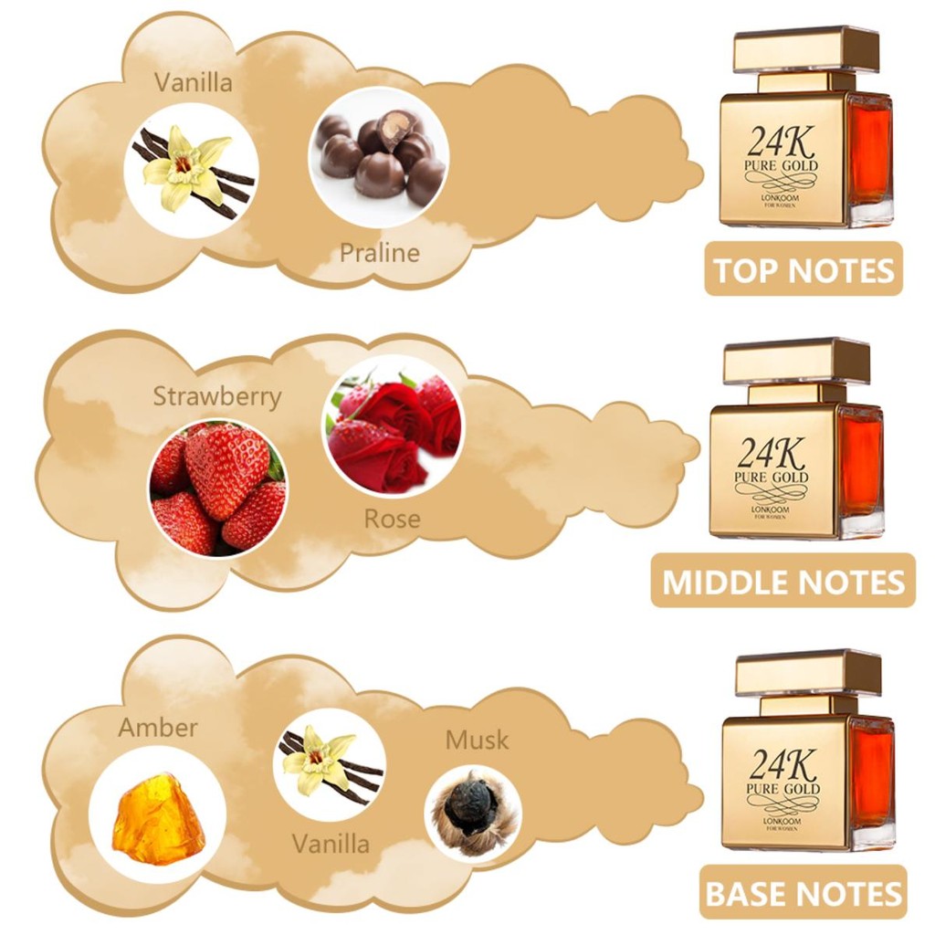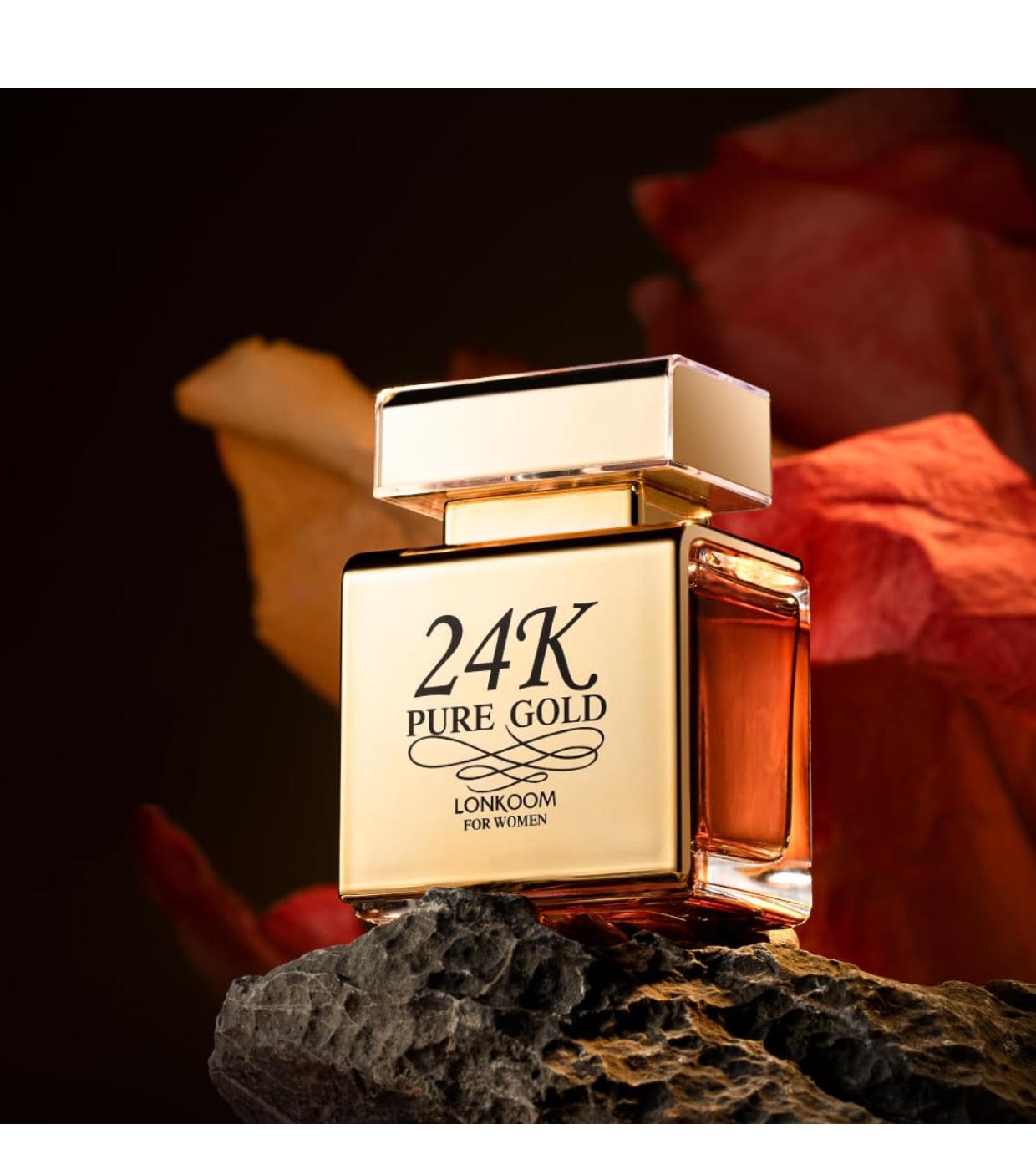 Entdecken Sie die Raffinesse von LONKOOM 24K Pure Gold Eau de Parfum , einem femininen Duft, der fruchtige, blumige und süße Noten für ein einzigartiges Dufterlebnis kombiniert.