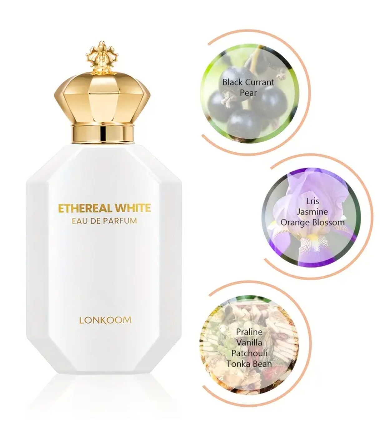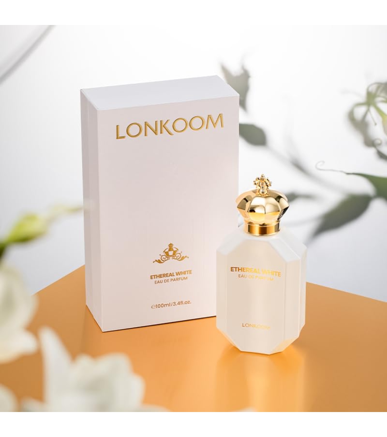 Lassen Sie sich von der Zartheit des Parfums LONKOOM Ethereal White umhüllen, einem femininen Duft, der mit einer harmonischen Balance aus blumigen, frischen und leicht moschusartigen Noten die Essenz von Reinheit und Sinnlichkeit einfängt.