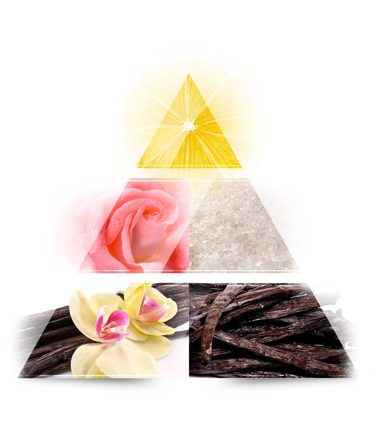Der frische Auftakt mit Zitronennoten verleiht dem Duft Leuchtkraft und Leichtigkeit und weicht einer Herznote, in der die Rose von einem zuckrigen Akkord umhüllt wird, der eine süße und raffinierte Note hinzufügt.