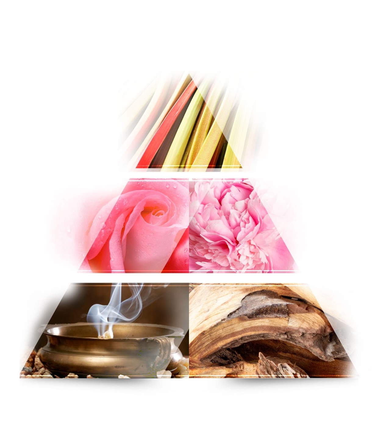 In der Kopfnote vereinen sich frische und saftige Aromen von Rhabarber, Litschi und Bergamotte mit einem würzigen Hauch Muskatnuss, der dem Duft Charakter verleiht.