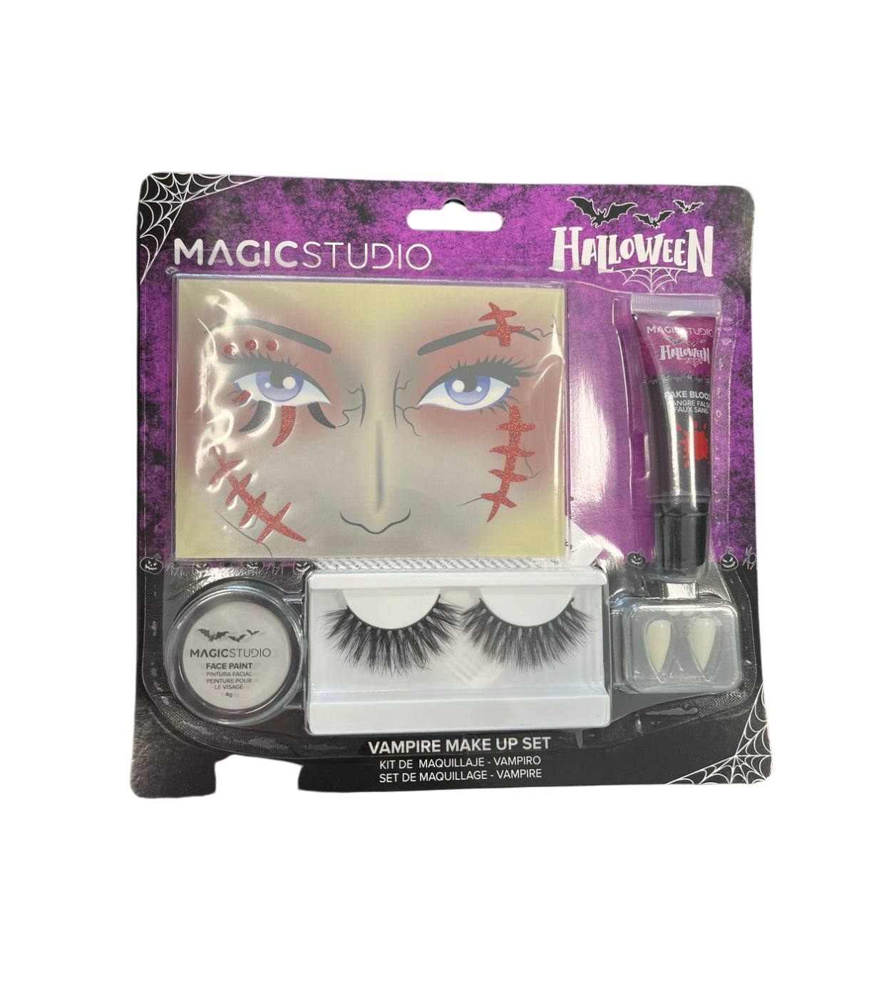 Verschönern Sie Ihren Halloween-Look mit diesem kompletten Make-up-Set! Verschönern Sie Ihre Augen mit falschen Wimpern, verleihen Sie mit echtem Blut einen gruseligen Touch, vervollständigen Sie Ihre Verwandlung mit künstlichen Zähnen und entfesseln Sie Ihre künstlerische Seite mit Gesichtsbemalung und Gesichtsaufklebern